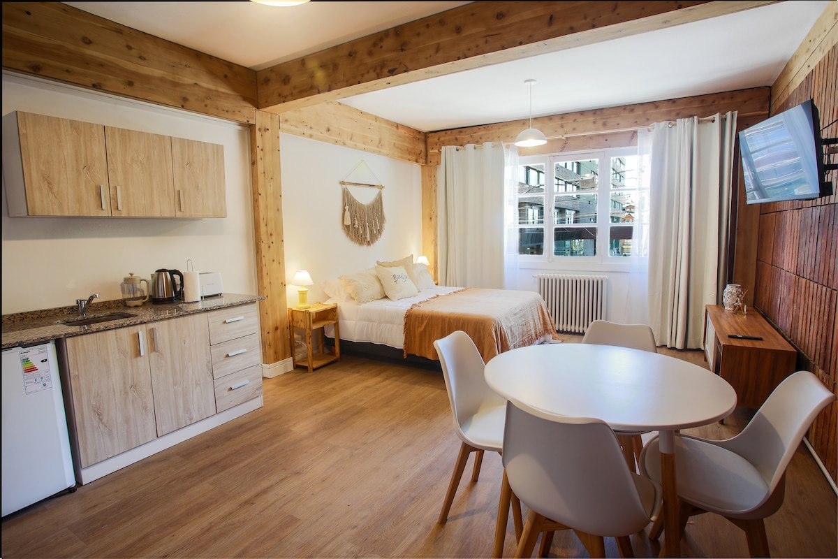 Monoambiente en Planta Baja rodeado de naturaleza y con muy buena vista al lago Nahuel Huapi. Se encuentra ubicado a 15 minutos de la ciudad. Cuenta con un Sommier King o dos Queen size individuales , un sillón que se convierte en cama simple o doble. En el mismo ambiente hay un escritorio. Cuenta con una cocina comedor amplia y completa. Tiene un hermoso y amplio balcón y un pequeño jardín. Equipado con un Smartv de 43 pulgadas, un asistente Alexa, jarra, tostadora, licuadora y cafetera.