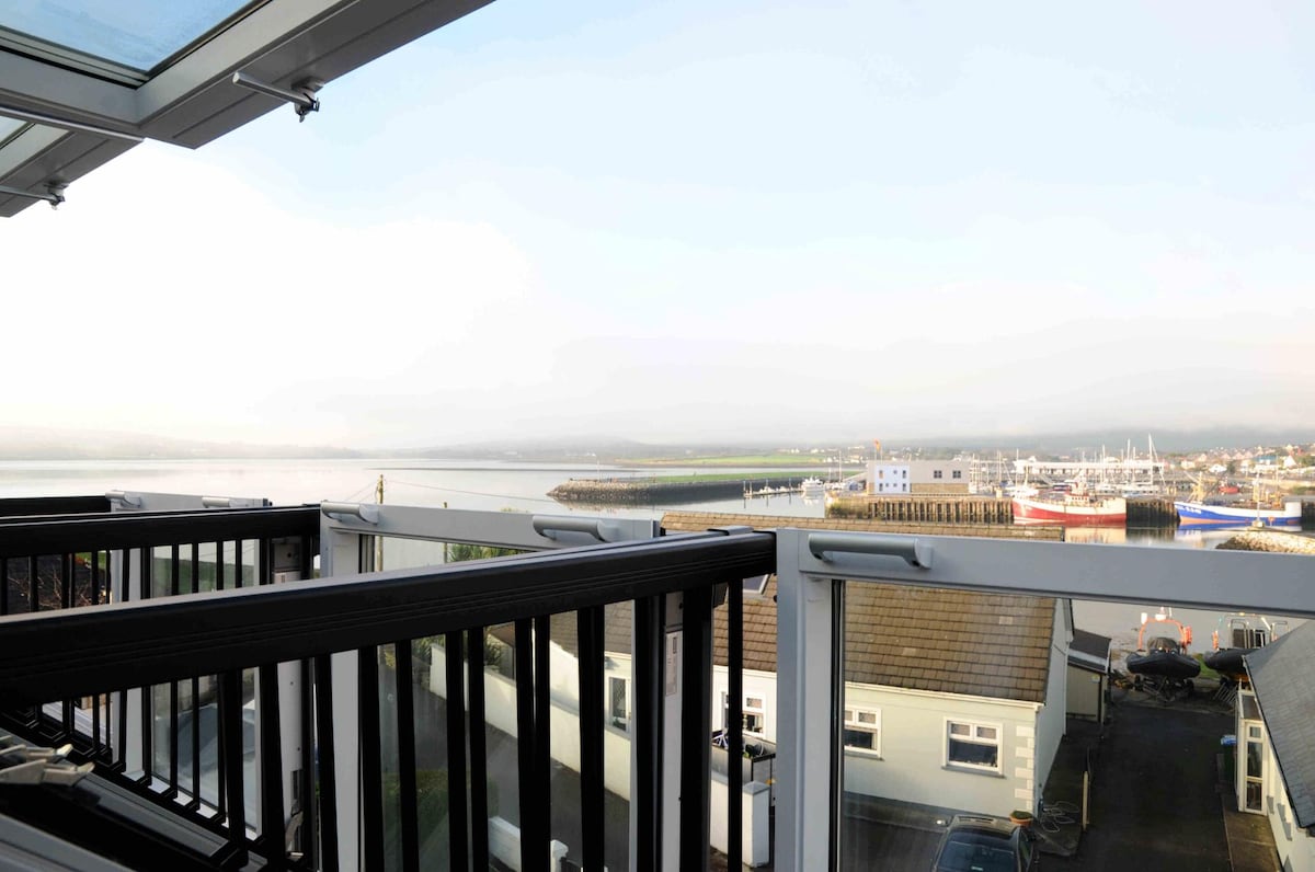 The Quayside Penthouse is a one-bedroom apartment overlooking Dingle Marina and is less than a 5-minute walk from the Dingle town centre. - Dingle Marina and Town Views - Fiber WiFi - 1 En-suite bedroom, sleeps up to 2 guests - Designed with the Guest In-mind; Finished to the Highest Standard- Bed linen provided - Heating, electricity and water Included - Smart TV - Elevator/lift - Private parking - Private entrance Fáilte Ireland/ISCF Ref: SCA60023.04.C