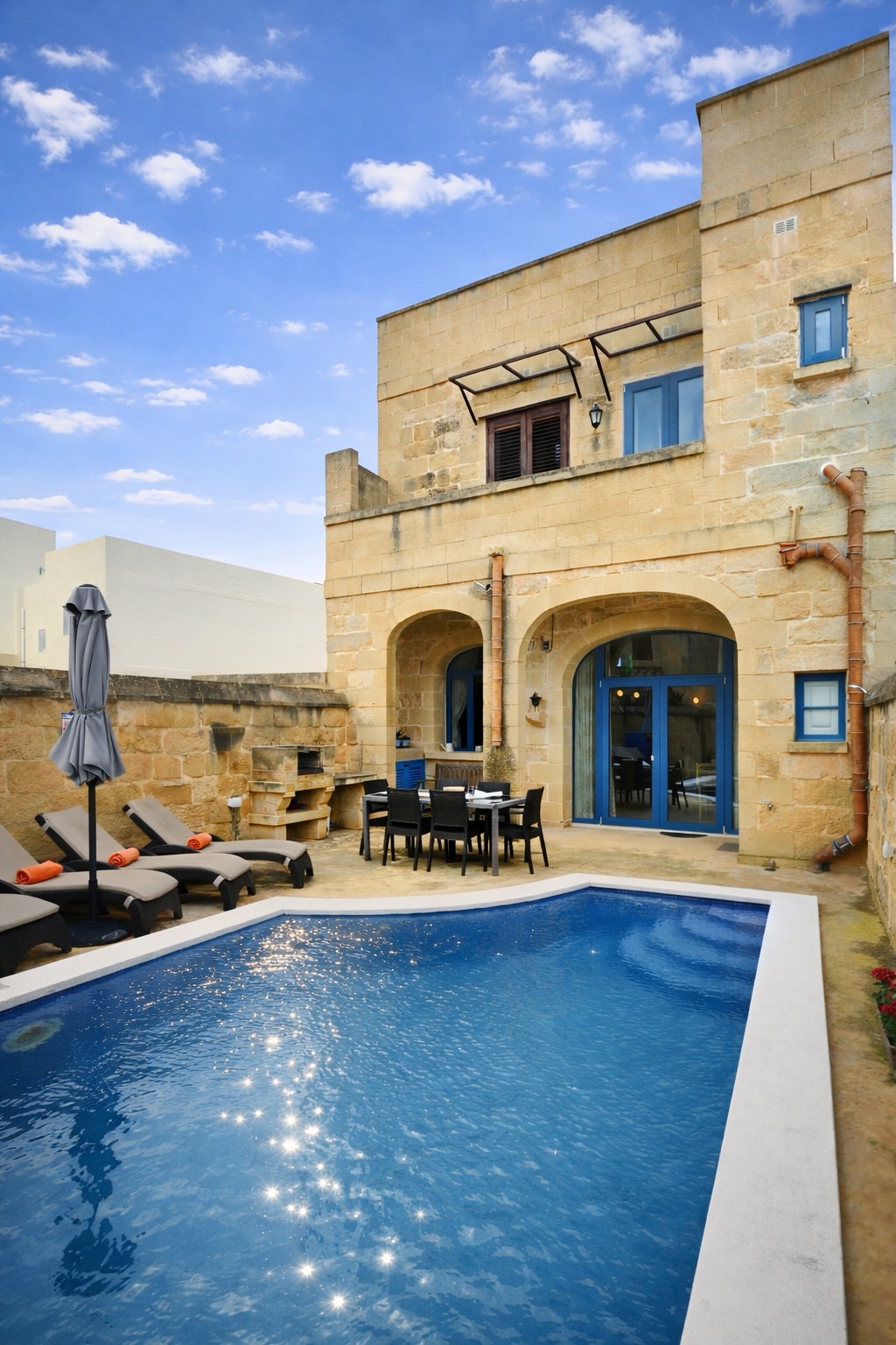 A house of character located in the south of Malta in the heart of a quiet town Zejtun ensures guests a peaceful and relaxing stay. Sleeps 9 persons . The house compromises of 3 bedrooms with air condition, a private pool with 6m long and 4m wide which has a Jacuzzi and swim jet, BBQ area, 3 bathrooms, 2 spacious kitchen / living /dining rooms, 2 washing machines, a large roof. Free wifi is also available. The house is close to shops, public transport, open market, chemist, banks.