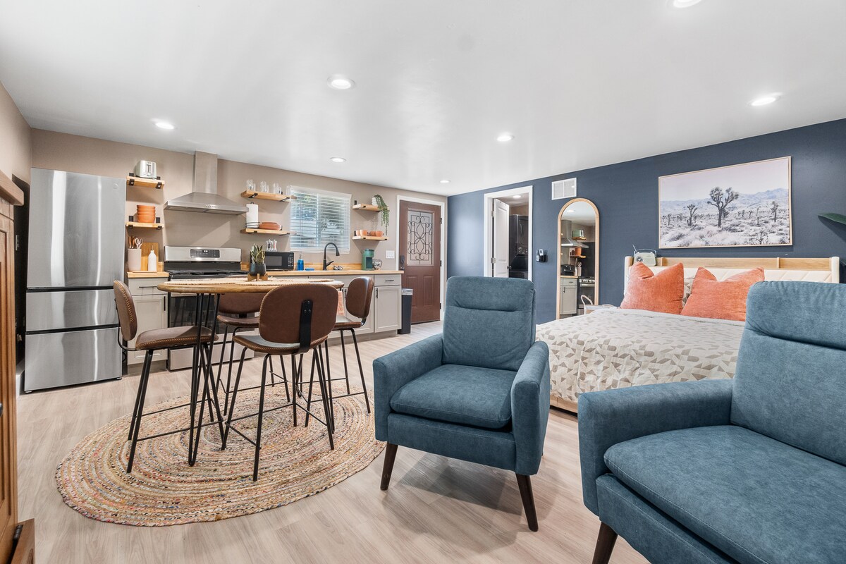 Enjoy a stylish experience in this centrally-located, new constructed guest suite. You have your own entrance, private bedroom, bathroom and kitchenette. As soon as you enter the suite you'll be welcome with a clean scent & cozy home feeling! You’ll enjoy superior rest in the comfortable queen size bed that guests rave about! While this guest room is attached to the main home, there is no direct access so you’ll have complete privacy. Also, no chores at checkout. Just lock up and go