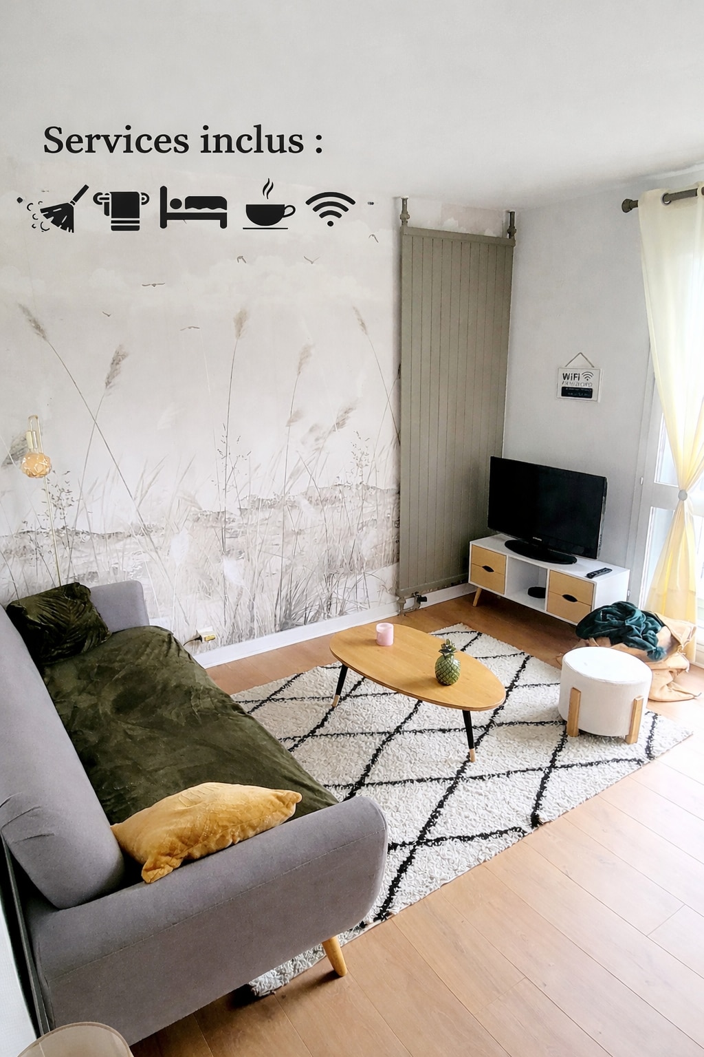 Au cœur de la ville, profitez de mon bel appartement chaleureux de 43 m², proche de tous commerces. Il est composé d'un grand séjour/salon, cuisine équipée (four, micro-onde, plaque vitrocéramique, grille pain, bouilloire…), chambre, salle de bain, douche, WC, lave-linge, Wi-Fi fibre, sticks de café, thé et sucre (cafetière Bosch). Stationnement gratuit à proximité dans la rue. Draps, serviettes et essentiels fournis (sauf gel douche). Arrivées anticipées et départs tardifs sous conditions.