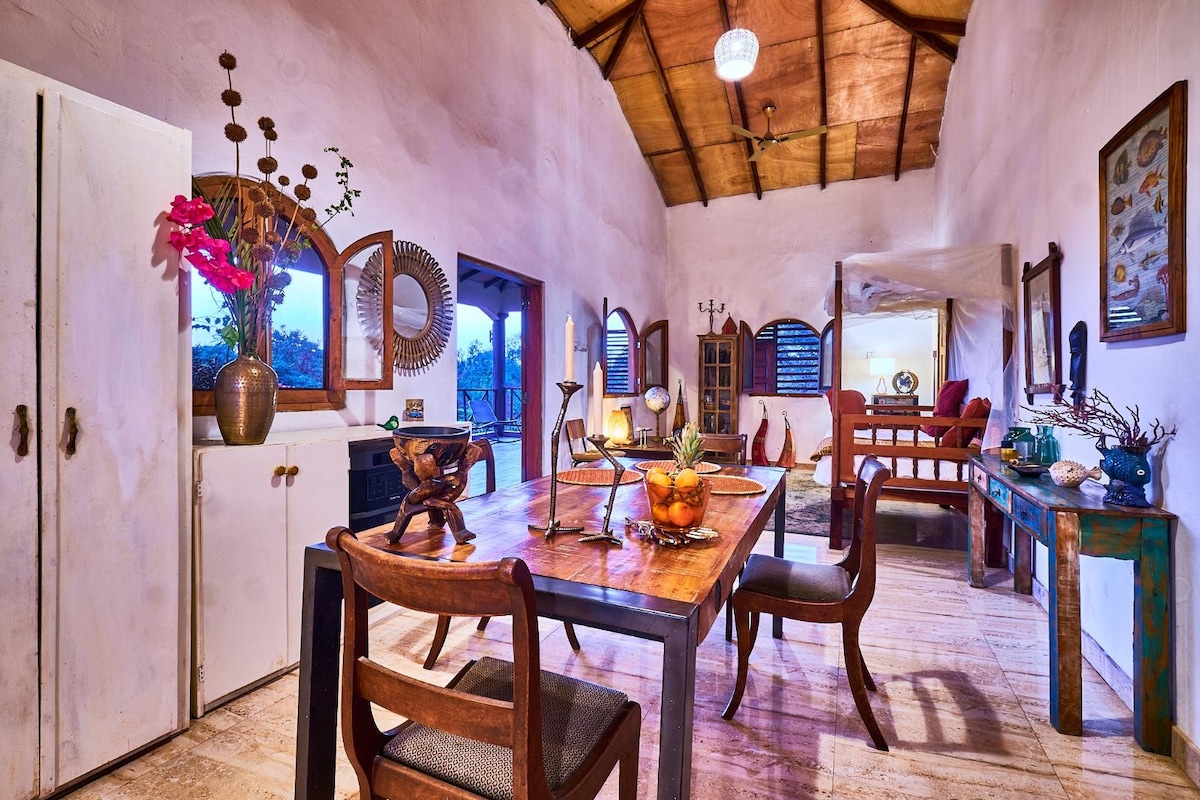 Jannah is a solid mahogany house on stilts overlooking the ocean and surrounded by jungle. It's one of the few houses at ABOUT TIME LODGE, which is a natural tranquil paradise right on the beach & only 40 mins from the airport. Jannah House has ensuite bathroom and solar generated electricity. See amazing wildlife too. You'll absolutely love this unique and romantic escape.