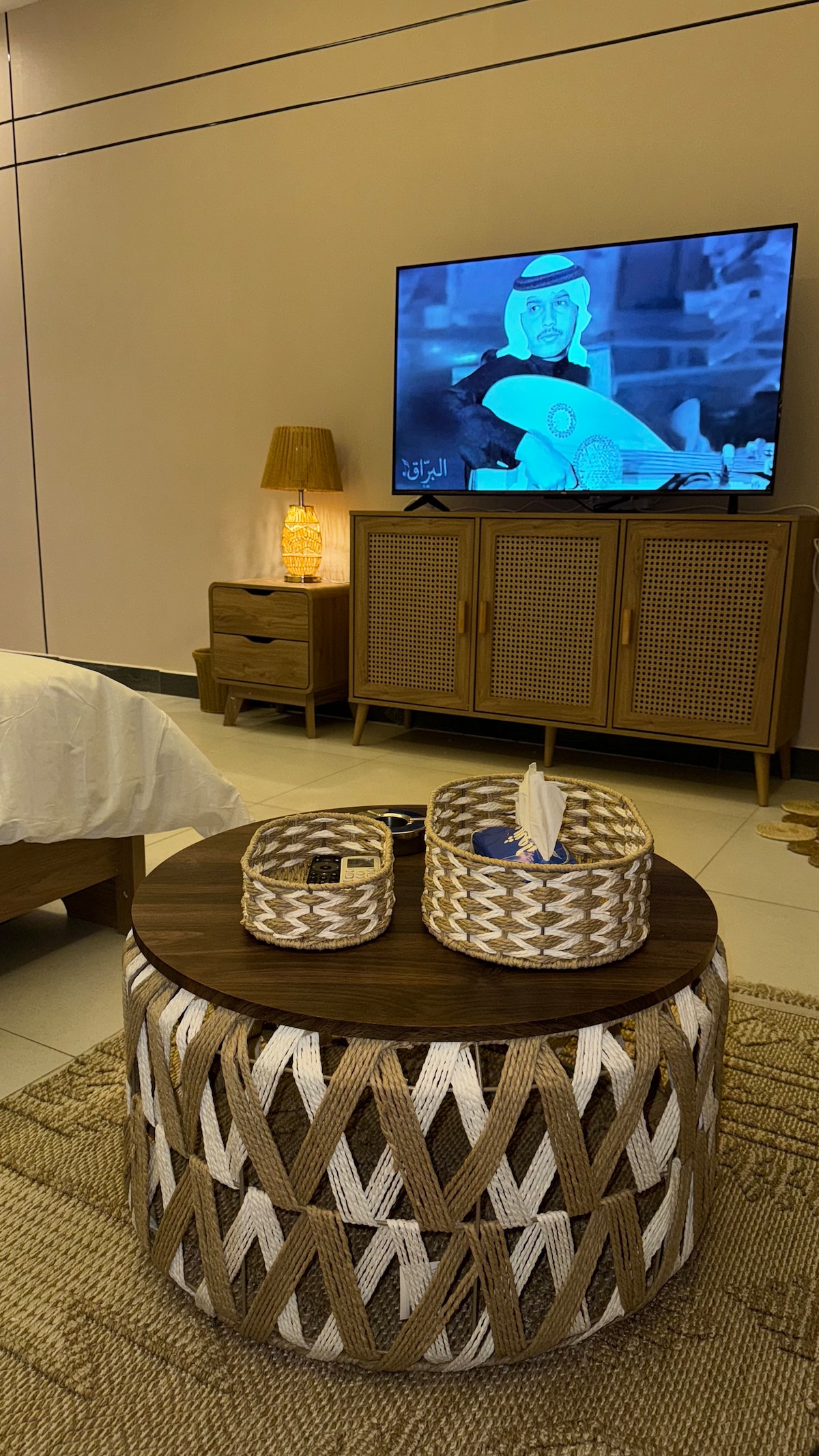 🚨🚙 Free Car Wash with every booking. Reward yourself at Irtahal Apartments, where elegance meets comfort. Enjoy a spacious and cozy lounge with a 65" TV featuring Netflix and more, perfect for those seeking a quiet retreat for studying, working, or leisure. The bedroom provides a relaxing atmosphere with soft lighting. Amenities include an American coffee machine, Turkish coffee maker, kettle, steam iron, mini fridge, and microwave