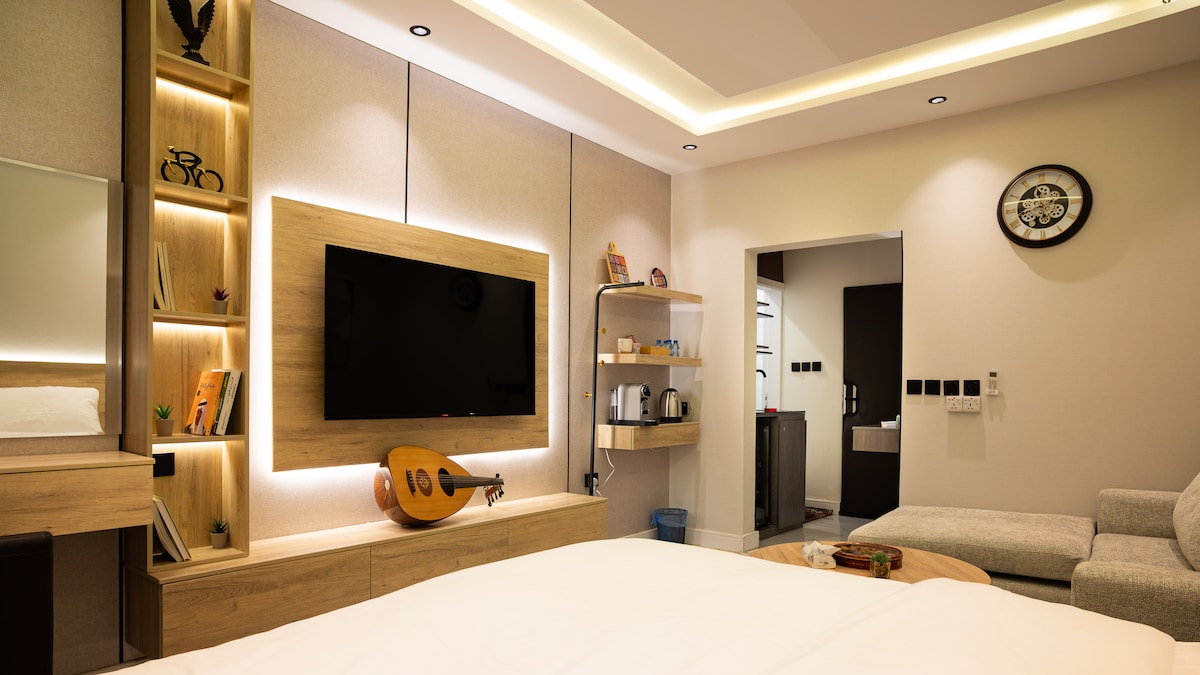 Royal Suite 🏨 Location: Hittin District | Riyadh 📍 Prime Location: Close to all services and events 🛍️🎢 Saad Square: 3 min Riyadh Boulevard: 5 min Laysen Valley: 10 min Financial District: 15 min Riyadh Park: 13 min Airport: 17 min Suite Composition: Room + Living Room + Kitchen + Bathroom Services: 85 inch TV, Comfy Couches. Fully stocked bathroom: soap, shampoo, conditioner, toothbrush Adjustable lighting Refrigerator, tea maker, microwave