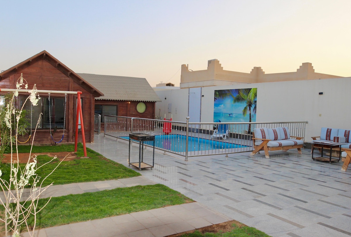 High luxury apartment with: 1- BBQ 2- Outdoor jacuzzi 3- private entrance + self entry 4- waterfall 5- garden 6-projector 7- coffee machine+popcorn maker 8- Kitchen with equipment 9- Hotel Robes, towels and slippers 10- Bose sound sys in all home شقة مودرن عصرية للاستجمام وراحة البال 1- شواية 2- ساوند سيستم كامل بالشقة 3- جاكوزي خارجي 4- مدخل خاص 5- شلال 6- حديقة 7- بروجكتر خارجي 8- قهوة ( بلاك + كبسولات ) + آلةالفشار 9- مطبخ بكامل التجهيزات 10- ارواب و سليبرات فندقية