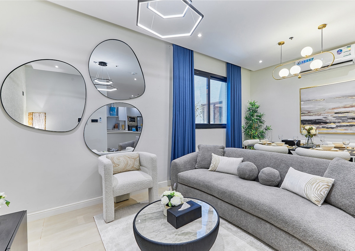 A luxurious apartment, equipped with modern furniture and all amenities for comfort and relaxation. It consists of two main bedrooms and Free extra bed, 4 bathrooms and a living room that fit up to 6 people, and a designated room for laundry, in addition to a full equipped kitchen, The apartment also gives you access to the Gym, swimming pool, lounge and meeting room.