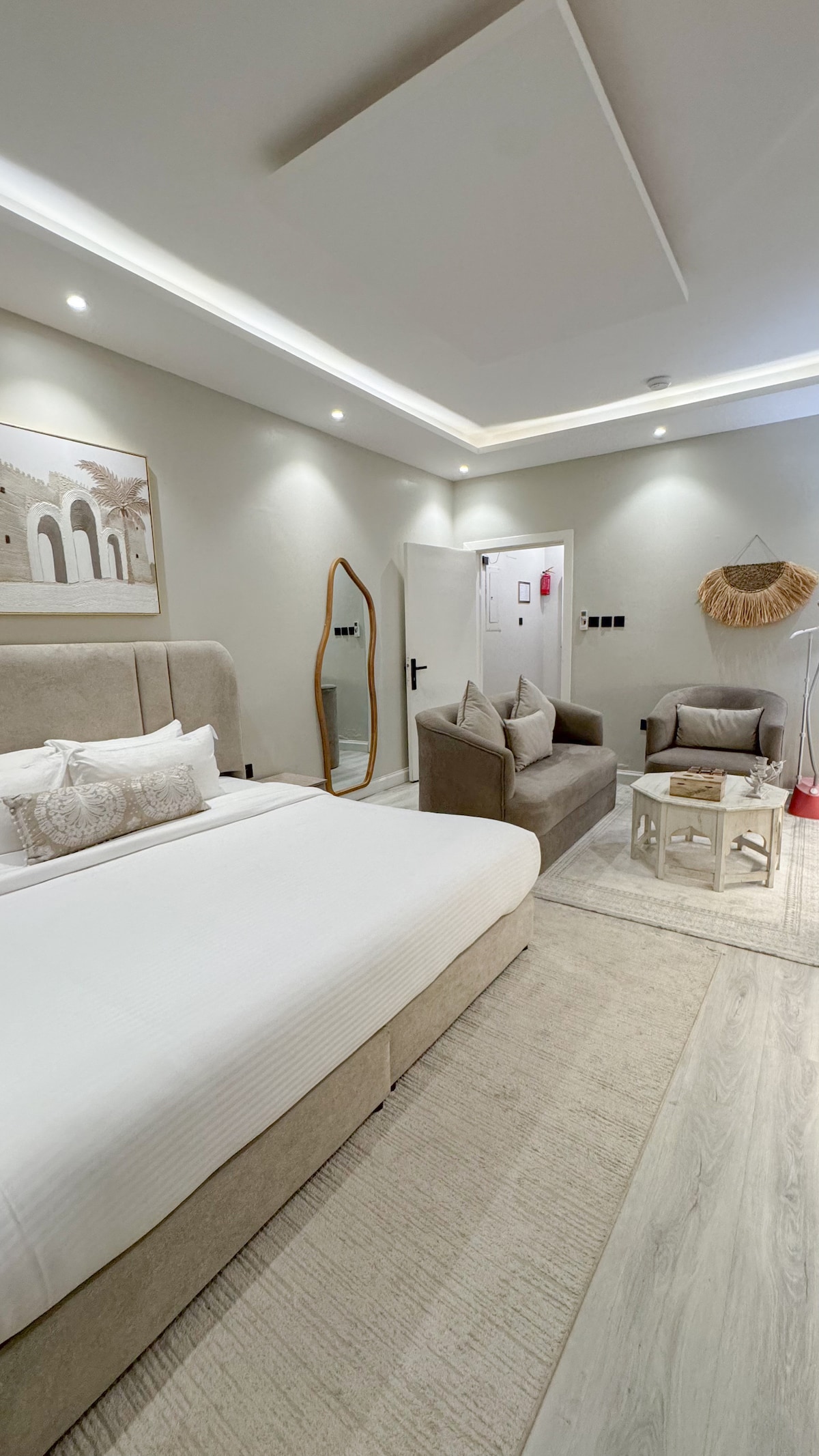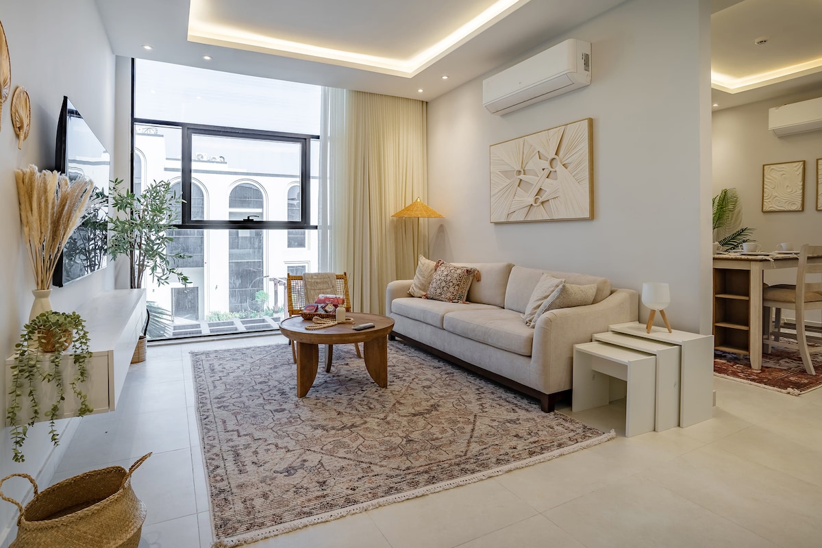 Boho-style retreat in Al Narjis! Cozy 1BR apartment with living area, equipped kitchen, 2 bathrooms, and a 4-seat dining table. Natural plants add freshness, soft lighting and warm tones create a relaxing vibe. Perfect for solo travelers, couples, or short stays. Fast Wi-Fi, AC, and parking included. Enjoy comfort, style, and a peaceful Riyadh stay in a brand-new, inviting space.