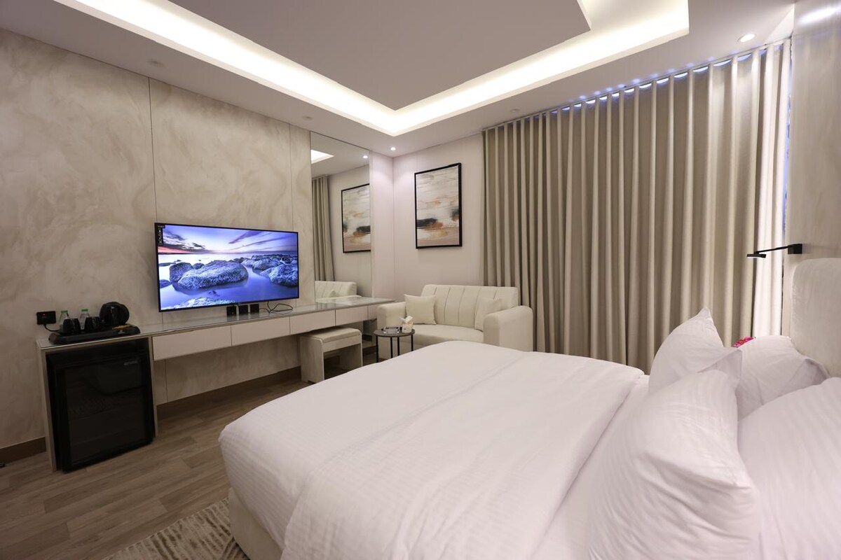 The elegant studio is located in a cozy neighborhood in Riyadh, Hittin. This simple studio has a premium location within walking distance to great places and landmarks. With a king-size bed. The sofa is comfortable in front of a smart TV screen and you can watch your favorite movies and shows. There is a kitchenette. The bathroom is equipped with towels and soap.