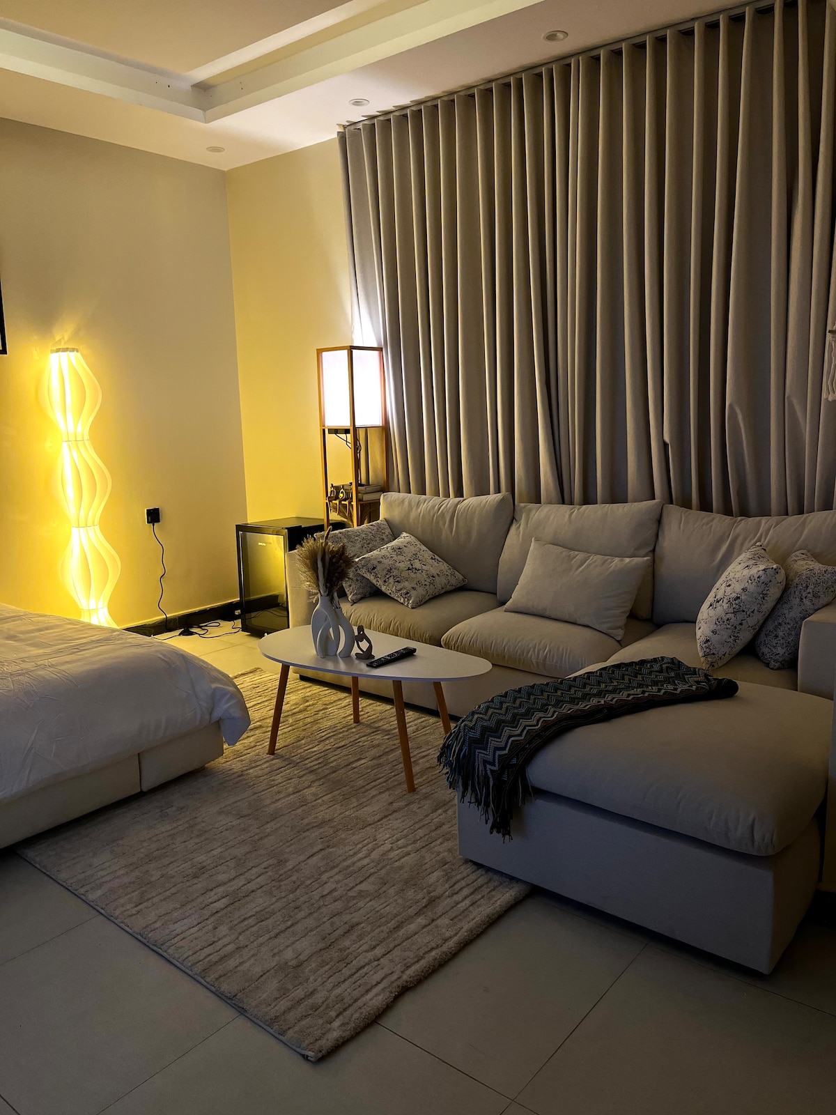 Royal Suite 🏨 Location: Hittin District | Riyadh 📍 Prime Location: Close to all services and events 🛍️🎢 Saad Square: 3 min Riyadh Boulevard: 5 min Laysen Valley: 10 min Financial District: 15 min Riyadh Park: 13 min Airport: 17 min Suite Composition: Room + Living Room + Kitchen + Bathroom Services: 85 inch TV, Comfy Couches. Fully stocked bathroom: soap, shampoo, conditioner, toothbrush Adjustable lighting Refrigerator, tea maker, microwave