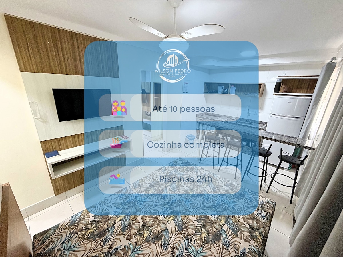 EXCELENTE APARTAMENTO COM VISTA PARA O PARQUE AQUÁTICO. Suíte com cama box Queen, ar-condicionado, TV, armários, criados e cortina com black-out; Quarto com 2 camas box (+ 02 auxiliares), criado, ar-condicionado, e cortina com black-out; Banheiros com armários e box no banho; Sala com sofá, TV de tela plana, aparelho de dvd, mesa com 6 cadeiras, bancada com 2 banquetas, ventilador de teto; Cozinha tipo americana com fogão, geladeira inox, micro-ondas, sanduicheira e utensílios. Área de serviço.