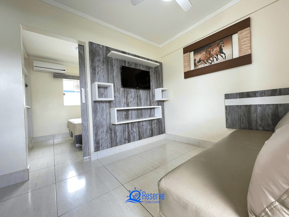 Apartamento no L'acqua diRoma IV com suíte, sala e cozinha, bem próximo do Jardins Acqua Park. Possui 1 cama queen no quarto, 1 cama box casal na sala e um colchão solteiro, 2 TV's a cabo, ar condicionado, ventilador, microondas, frigobar, filtro com água gelada, fogão elétrico de duas bocas, talheres, copos e pratos. Os hóspedes tem acesso gratuito ao parque aquático que funciona 24 horas e conta com 12 piscinas, bares e restaurante. *Não incluso roupa de cama e roupa de banho.