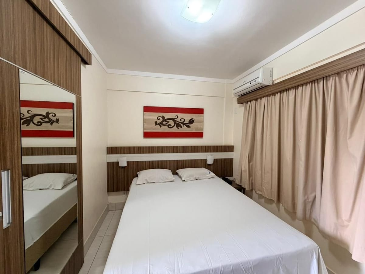 O apartamento térreo. Um dormitório 1 cama de casal queen, guarda-roupas, TV, ar condicionado. Banheiro com box. Cozinha com geladeira, fogão elétrico, panelas e utensílios domésticos, micro-ondas. 1 vaga. Sala 1 sofá-cama, sendo 2 camas solteiro, ou 1 de solteiro e 1 casal, TV. Você pode passar o tempo no parque aquático e desfrutar das piscina ao ar livre, piscina para crianças, salão de jogos, fitness, brinquedoteca, restaurante, bar, loja e jardim. Roupas de cama e banho não estão inclusas.
