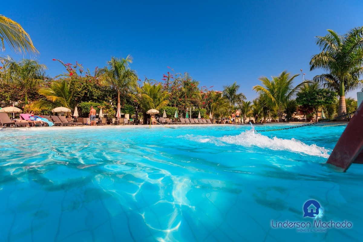 Que tal alguns dias no paraíso? ✨🌴 Hotel super bem localizado, perto do centro, com fácil acesso a padarias, 🛒 mercados, 🎨 feira de artesanato e 🍽 restaurantes. Conta com 🕘 recepção 24h, ☕ cafeteria, 🍴 restaurante, 🛍 lojas, 📶 Wi-Fi, 🎲 área de jogos e recreação. 💦 Destaque para o complexo com 10 piscinas: ♨️ águas termais, ❄️ frias e 🔥 aquecidas, 🏊 piscina semiolímpica, 🍹 bar molhado, 🎢 toboáguas, 🌙 piscina 24h, 💧 cascata, 🧖 sauna e 🎉 recreação diária para adultos e crianças.