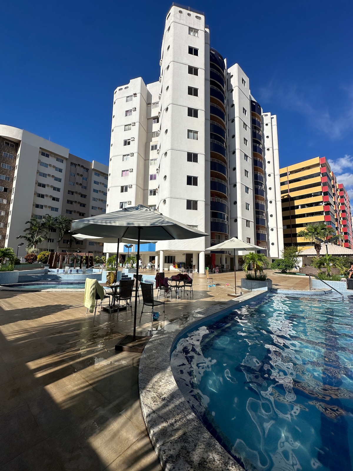 Churrasqueira de carvão no AP; acesso até 23h as 7 piscinas, 3hidros, pode levar bebidas/ comidas nas mesas das piscinas); Sauna; Salão de Jogos; Sala de convivência; Playground; garagem; Ar Condicionado; ventilador, TV 43-Sala; TV 32-Quarto; Wifi; panela elétrica de arroz e feijão; ferro; liquidificador; filtro de água; secador; sanduicheira, Cafeteira; Fogão; Microondas; panelas; utensílios de cozinha. Próximo: supermercado, farmácia, bares, parques, shopping Singapura e feirinha do luar.