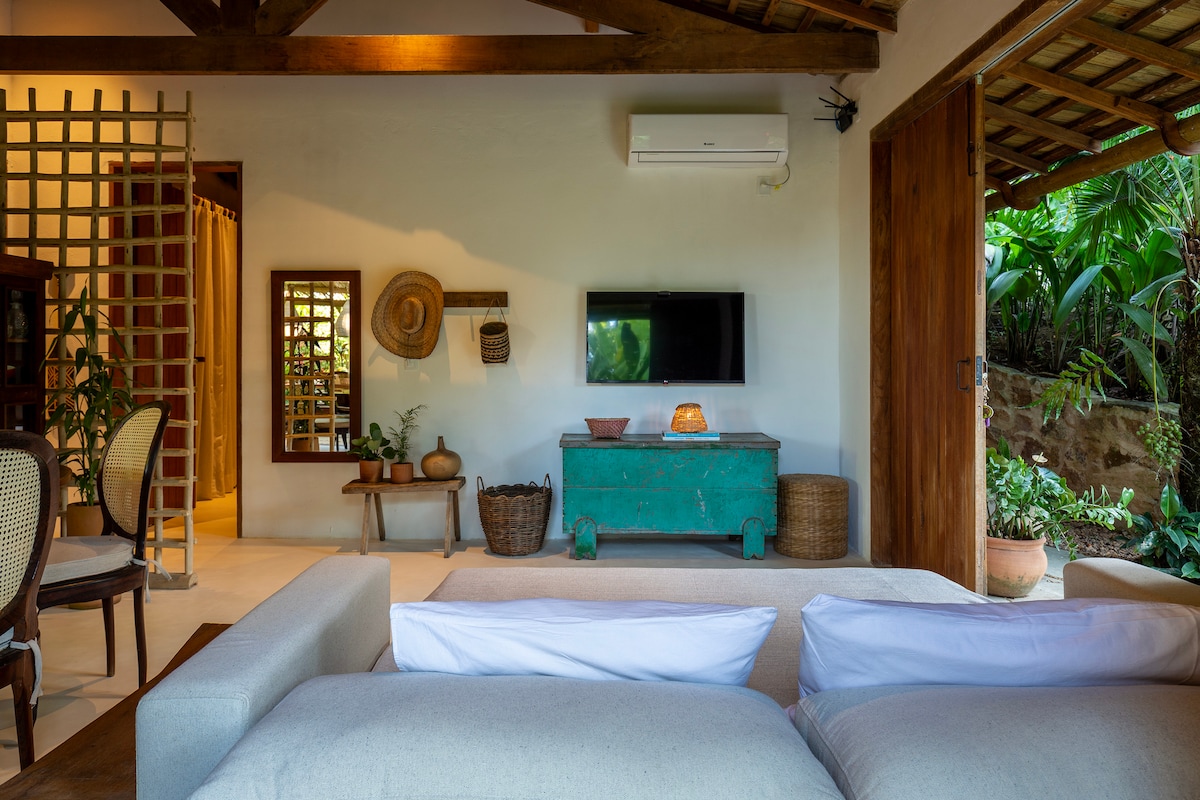 Located in the heart of Trancoso, in a safe, quiet and beautiful neighbourhood, surrounded by stunning nature, at 3 mn walking distance from the Quadrado, 10 from the beach, this freshly built chalé entirely made of recycled cedar wood is the haven you have been dreaming of .... full equipped kitchen, burning hot water, full pressure shower, air conditioner, king size bed with fine Egyptian cotton bedsheets, design furniture, comfortable outdoor terrace .... can even fit 2 kids in the room ..