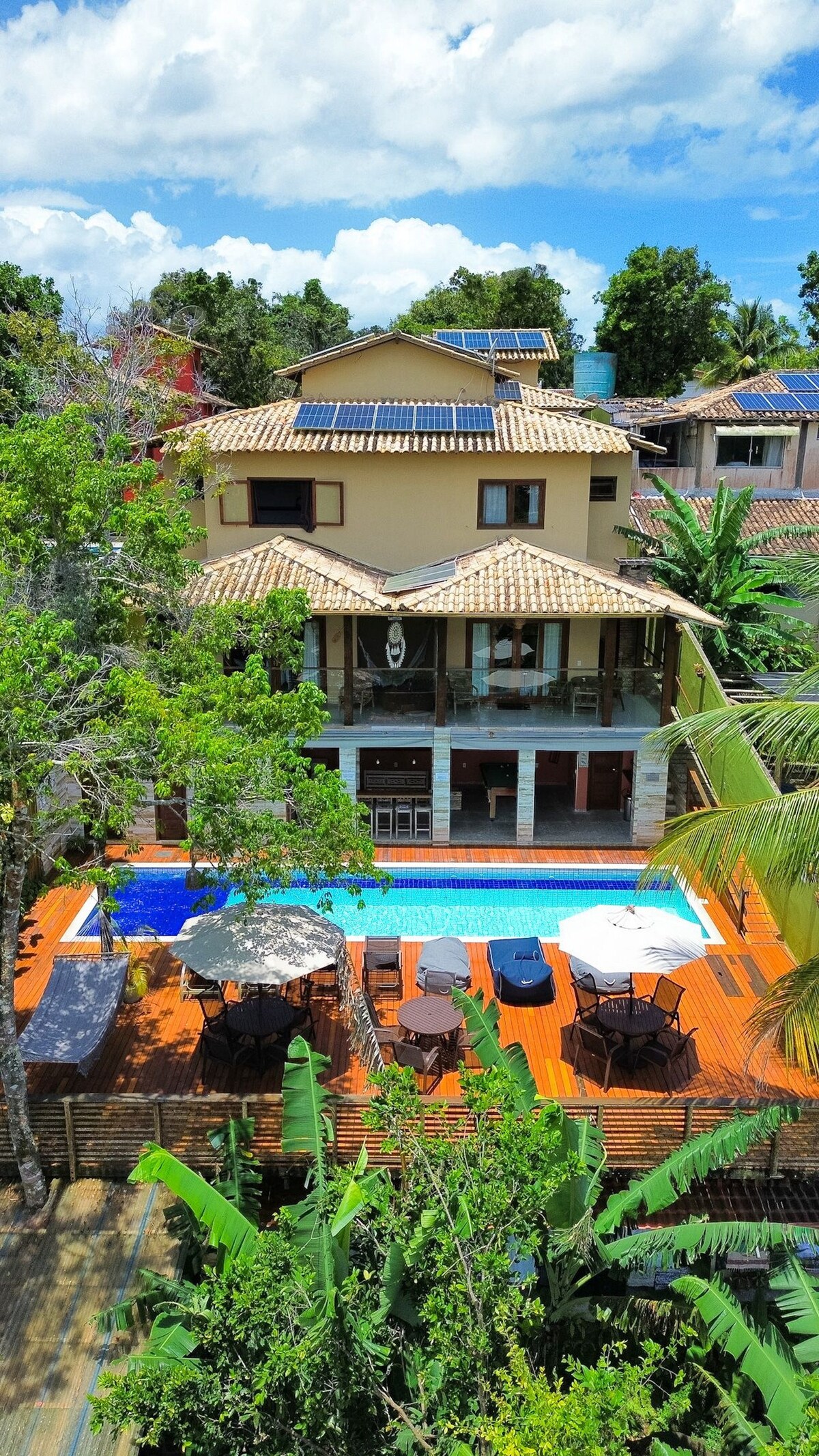 Localizada no condomínio Outeiro das Brisas, Praia do Espelho: São 05 suítes com ar - condicionado, sala de estar e sala de TV ambas feitas focada no conforto e bem estar dos nossos hóspedes, cozinha equipada, disponibilizamos roupa de cama budmeyer 300 fios, toalhas de banho e piscina. É OBRIGATORIO a contratação dos serviços a parte de cozinheira, arrumadeira.