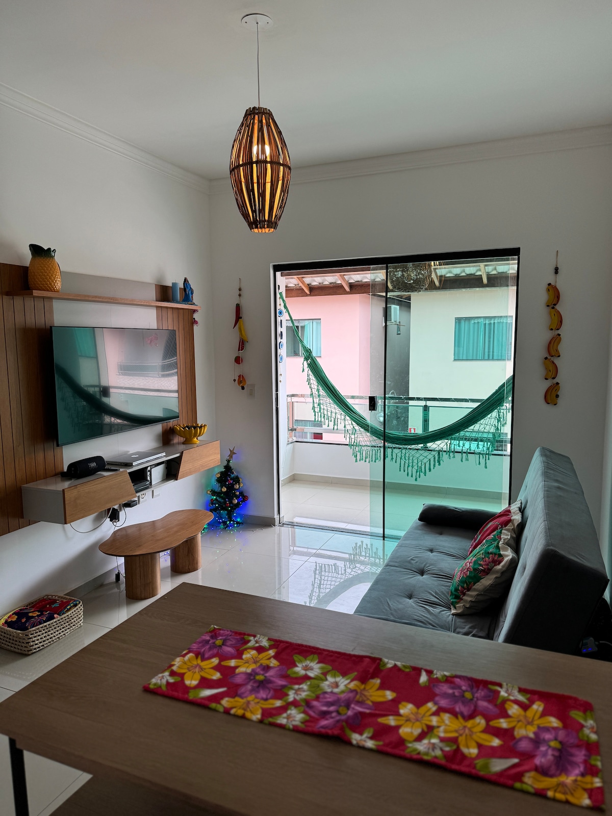 Apartamento térreo com 1 suíte, medindo 50 m2, composto por sala, copa e cozinha, todo mobiliado e suíte equipada com ar condicionado split e ventilador de teto, televisão com antena parabólica na sala e na suite, área de lazer com piscinas, quiosques de churrasqueiras, duchas, wi-fi no apartamento e estacionamento para 01 veículo de pequeno porte em áreas do condomínio. Fornecemos roupa de cama e banho. A limpeza de check-in e de check-out estão incluídas sem custo adicional.