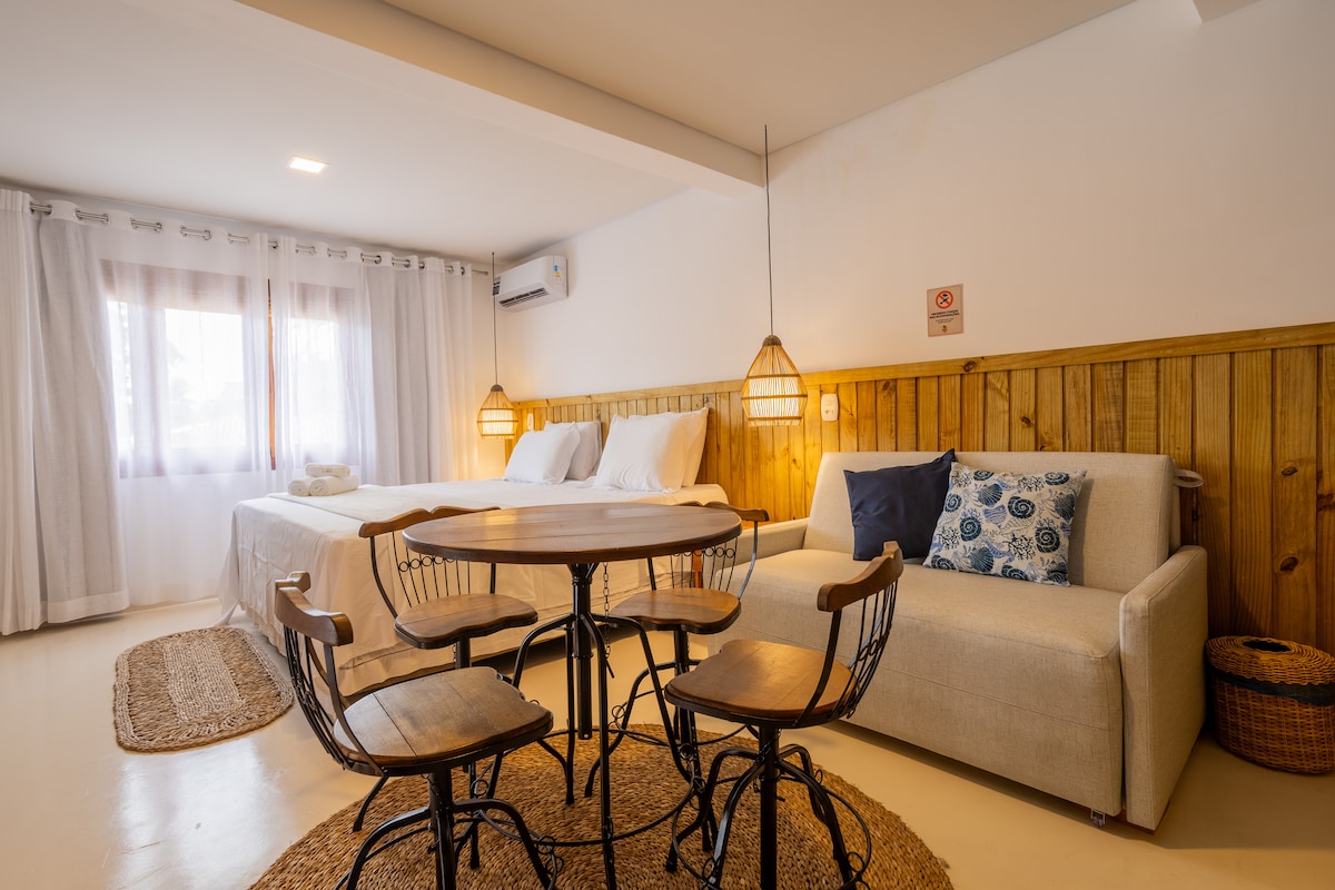 Pensado especialmente para quem viaja com a família, nossos aptos com vista para o jardim oferece o conforto e a praticidade que vocês merecem durante as férias em Arraial d'Ajuda. O apto conta com: * Espaço compacto, aconchegante e funcional; * Ar Condicionado, frigobar, microondas e fogão. * 1 Cama Box de Casal e 2 Camas box de Solteiro; Na área comum do condomínio, a família toda aproveita: * Quiosque com churrasqueira; * Ducha ao ar livre; * Amplo estacionamento.