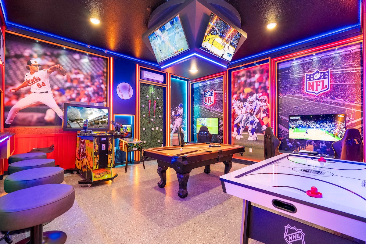 This special place is close to everything, making it easy to plan your visit. • Community: Paradiso Grande • 6 Bedrooms/6 Baths/Sleeps 16 • Disney - 10 miles • SeaWorld - 1.5 miles • ICON PARK - 4 miles • Convention Center - 3 miles • Universal - 7 miles • Exercise Equipment at the house • Fully Equipped Kitchen • Game Room with Arcade with 7500 Games, Pinball, Air Hockey • PRIVATE $35,000 HOME THEATER with 133" Screen and shakers on the seats • Business Grade Internet • Sauna • EV CHARGER
