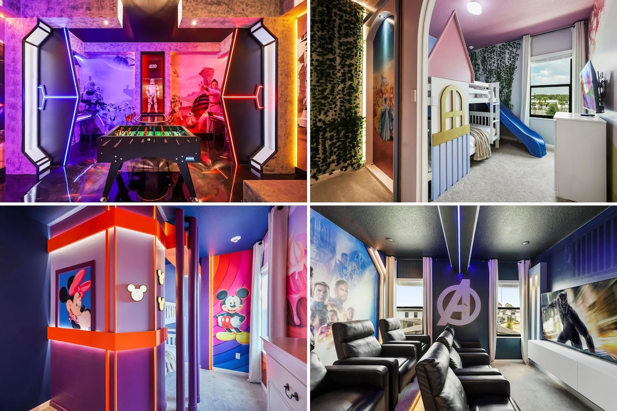 A vacation home that takes your entertainment seriously! That’s our 8-bedroom villa in Emerald Island Resort at 3 miles from Disney… Ready to enjoy themed bedrooms, a premium private movie theater with a 155-inch screen, 4K projector, 5.1 surround sound, and a PS5 for gaming? Relive your favorite films in stunning quality, just like in the best movie theaters. Private Pool and Spa will make your vacation unforgettable! We’re ready for families and groups, to offer fun, comfort, and luxury.