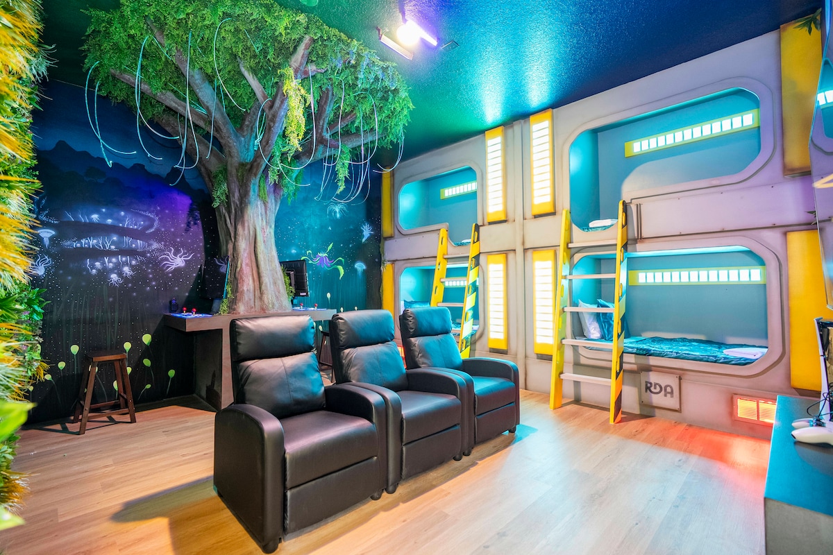 This special place is close to everything, making it easy to plan your visit. • Community: Paradiso Grande • 6 Bedrooms/6 Baths/Sleeps 16 • Disney - 10 miles • SeaWorld - 1.5 miles • ICON PARK - 4 miles • Convention Center - 3 miles • Universal - 7 miles • Exercise Equipment at the house • Fully Equipped Kitchen • Game Room with Arcade with 7500 Games, Pinball, Air Hockey • PRIVATE $35,000 HOME THEATER with 133" Screen and shakers on the seats • Business Grade Internet • Sauna • EV CHARGER