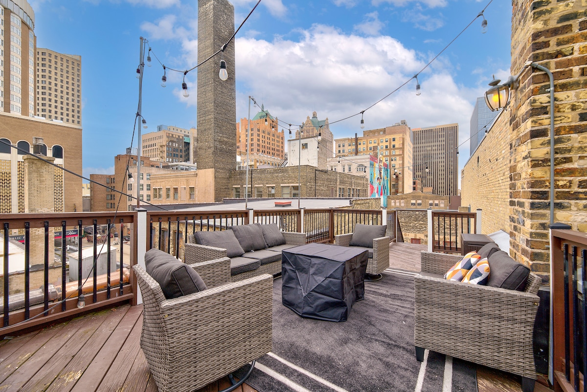 Soak your cares away in a luxurious 7-person hot tub while taking in breathtaking panoramic views of the Milwaukee skyline! This chic two-level condo, nestled on a hill above the Milwaukee River, puts you just a 10-15 minute stroll away from the vibrant energy of North Ave, Brady St, and downtown—where the action is always happening.