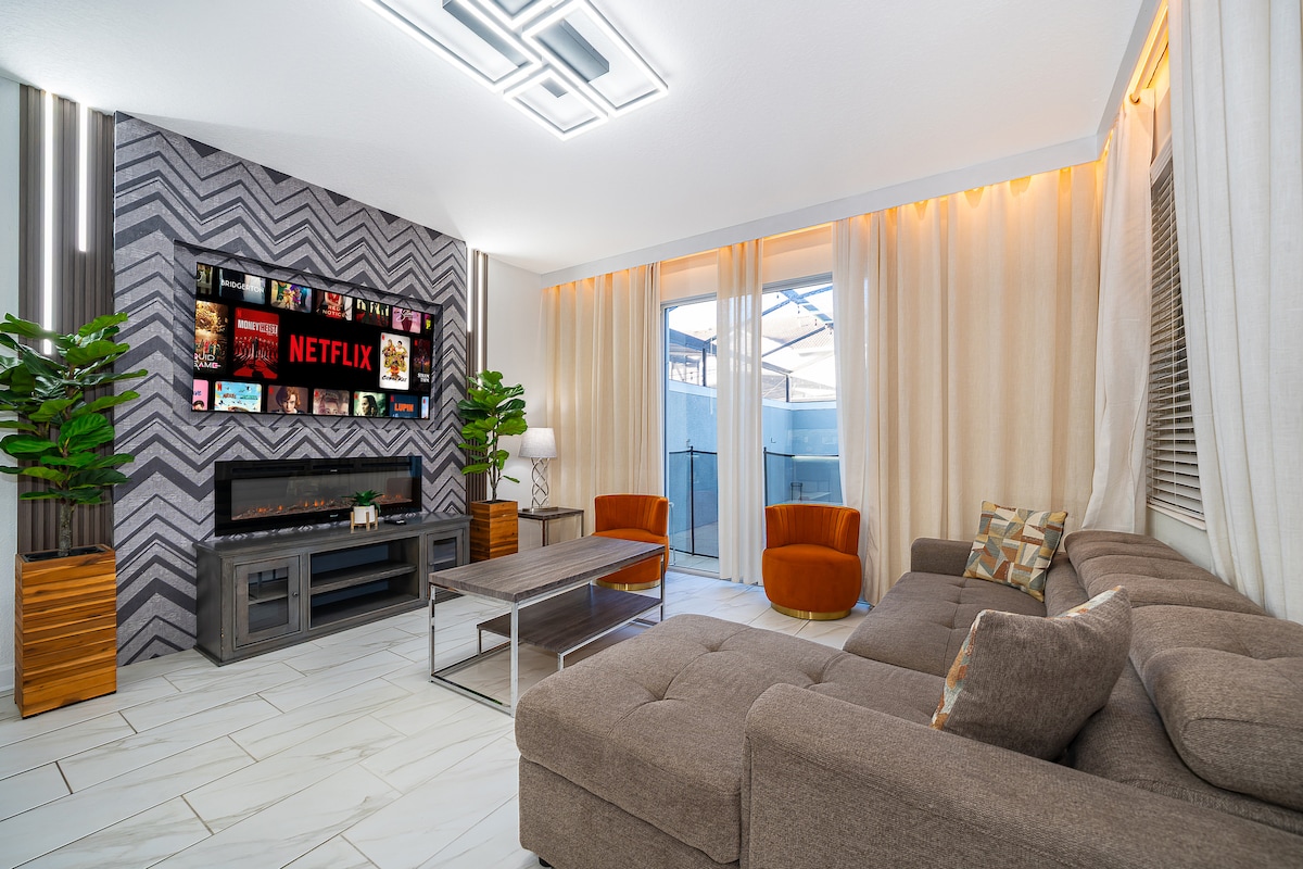 Larne Lodge has just gone through a full modern renovation! Located just 3 miles from Disney and 11 miles from Universal Studios, Larne Lodge is the perfect vacation spot for families and friends to make lasting memories! This spacious townhouse is located in a beautiful private and gated resort, which offers guests a shared pool with a pool bar, gym, bar, restaurant, games room, and a convenience store.