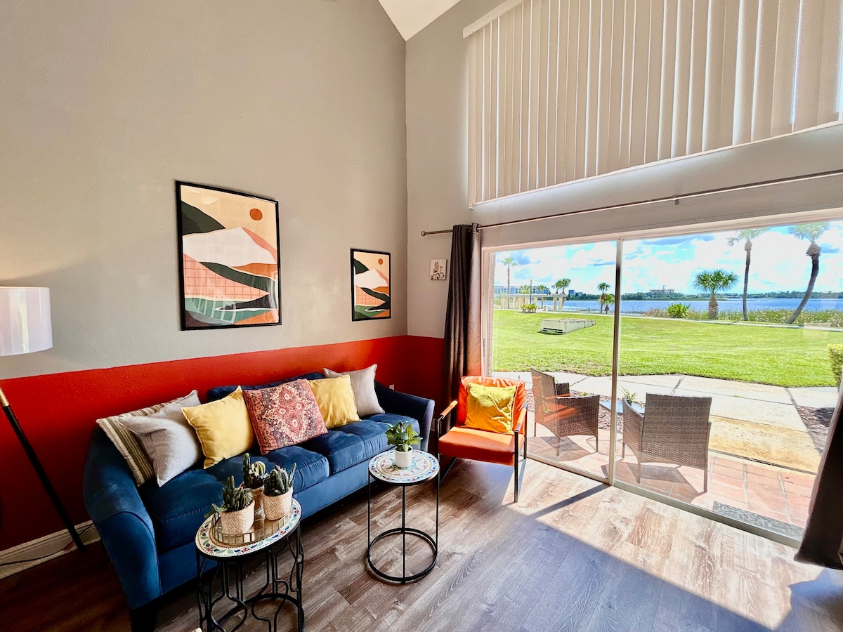 While away balmy evenings on the oversized screened patio and rest tired legs in the hot tub after a long day at the parks. This airy, spacious abode combines patterned rugs and cushions with leafy house plants and botanical prints for a calm vibe.