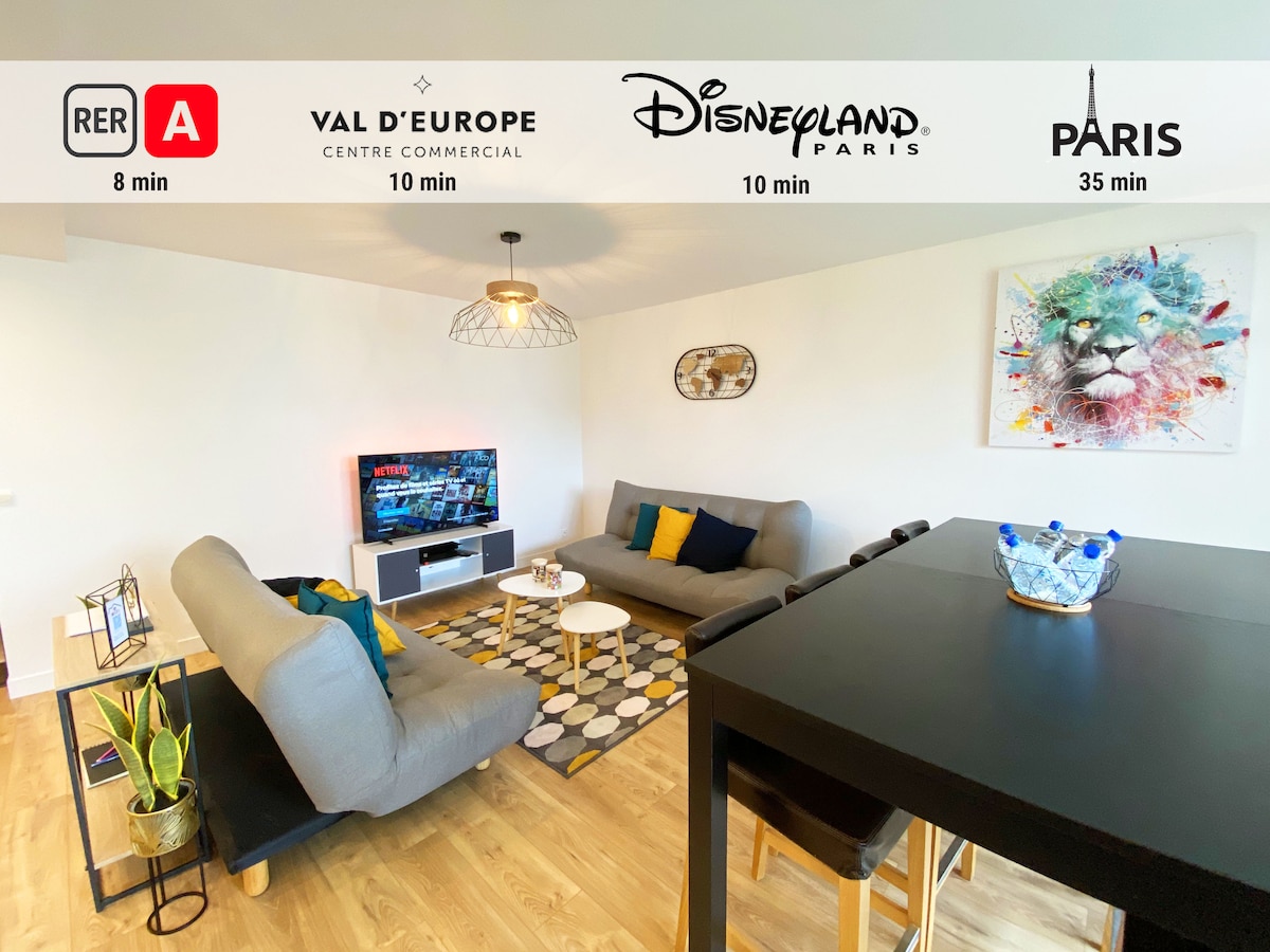 Situé à seulement 3,1 km des Parcs Disneyland Paris, à 8 minutes à pied de la station RER A Val d’Europe, 35 minutes de Paris en voiture et à 3 min à pied de toutes les commodités (boulangerie, commerces); cet appartement de 95m² avec balcon et parking est idéal pour des séjours en famille. ✦ Séjour en famille ou professionnel ✦ Cuisine entièrement aménagée et équipée ✦ Smart TV 4K (Netflix, Amazon Prime Video) ✦ Machine Nespresso ✦ Parking Sécurisé