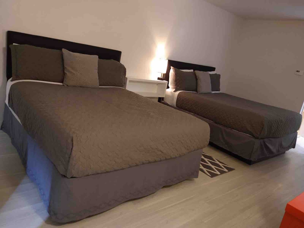 1-bedroom PRIVATE apartment suite with a full kitchen including all cookware/utensils, and 2 TVs in this suite in total. The room includes 3 full-sized beds. The bedroom has your choice of 2 full-sized beds or 1 King bed. Let us know after you confirm what you prefer. We also offer a great fitness center and guest laundry rooms so you can wash/dry clothing. You can pick up keys easily as our Front desk staff is on-site 24-hours per day and speaks English, Spanish, and Portuguese.