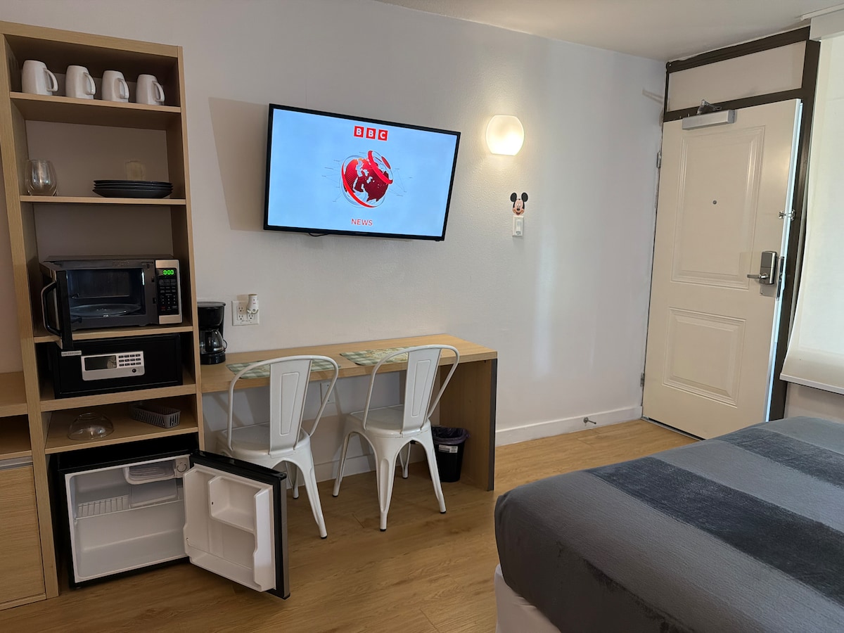 1-bedroom PRIVATE apartment suite with a full kitchen including all cookware/utensils, and 2 TVs in this suite in total. The room includes 3 full-sized beds. The bedroom has your choice of 2 full-sized beds or 1 King bed. Let us know after you confirm what you prefer. We also offer a great fitness center and guest laundry rooms so you can wash/dry clothing. You can pick up keys easily as our Front desk staff is on-site 24-hours per day and speaks English, Spanish, and Portuguese.