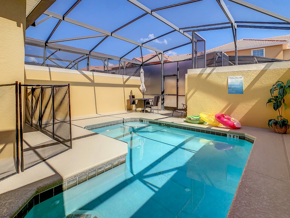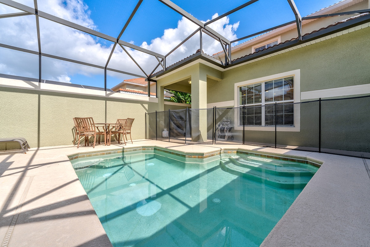 -500 sq ft AC event space available for extra charge (message me for info prior to booking) PERFECT FOR FAMILIES ! -your own Private screened Pool (heated for $25/day) -less than 10 miles to Disney. -sleeps 8 with 1 bedroom and bathroom on the 1st Floor. - secure, gated resort of Encantada. -Guests enjoy free access to everything in the resort including a heated community pool, hot tub, fitness center, playground, restaurant, & more. Community has beautiful lake with walking area