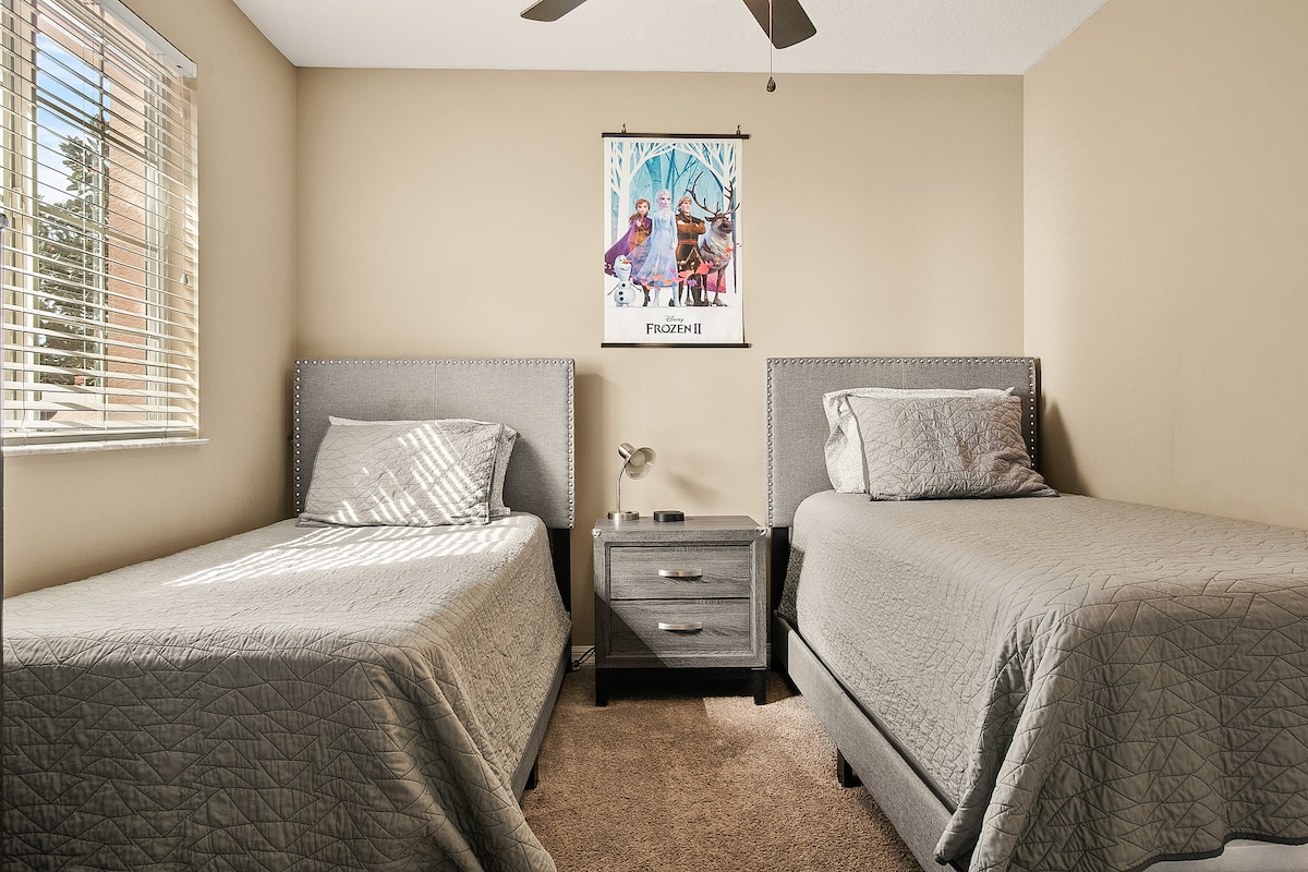 Give your family the Disney Resort experience in this magical townhome located only 10 mins (5 miles) from Disney property. Not only do you have access to your own personal hot tub, you will have access to the clubhouse which includes two pools, a fitness center, and a restaurant. This home will fit all your Disney needs with artwork from all your favorite movies, a castle themed primary bedroom, and a Mickey Mouse kids bedroom with twin beds. This home fits 6, including a pull out bed couch.