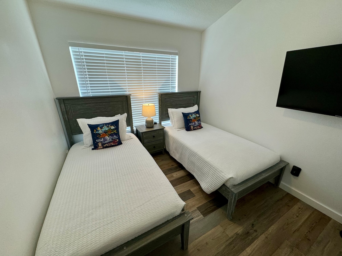 Stylish 3BR/2.5BA townhome in Enclaves at Festival near Disney, Universal & more. Features smart TVs, a full kitchen, themed bedrooms, a game room, a private patio & resort amenities including a heated pool, a gym, and a splash park. Includes free Wi-Fi, parking, and starter essentials. Perfect for families or friends seeking a magical Orlando stay!
