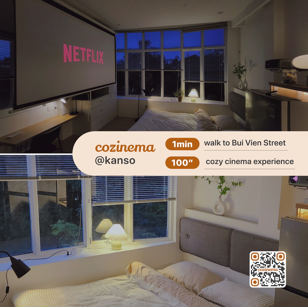 Kanso @ Cozinema offers three unbeatable features: 1. Prime Location: Heart of HCMC, 1 min to Bui Vien Street and 5 mins to Ben Thanh Market. Surrounded by cafés, local eats, and public transports right at your doorstep. 2. Skyline & Parkfront Views: Enjoy a breezy balcony overlooking 23/9 Park, blending lush greenery with stunning city skyline lights at night - the perfect balance of calm and vibrant. 3. Cinematic Retreat: 100" 4K projector & Dolby 5.1 audio for ultimate relaxation.