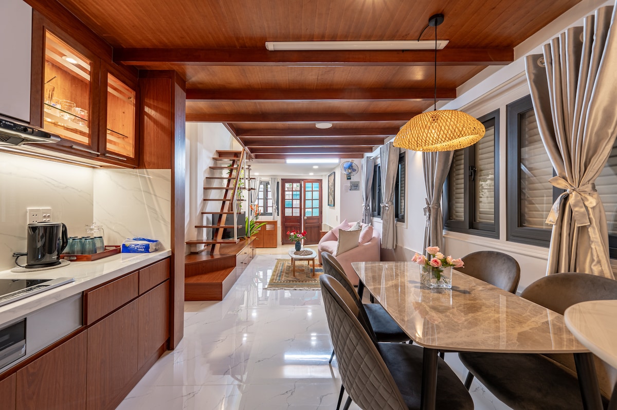 Welcome to our peaceful homestay—a sanctuary of cosiness, beauty, and calm in the heart of D1. Designed in a Wabi-Sabi style, our 3-BR, 3-BA home celebrates natural textures and the art of simplicity. Each bedroom with its own private bath is a minimalist haven with soft linens, neutral palettes, and generous natural light coming from the skylight in the house. Unwind under the sky on our small rooftop terrace. Lounge with a coffee in the morning or enjoy the evening breeze with wine.