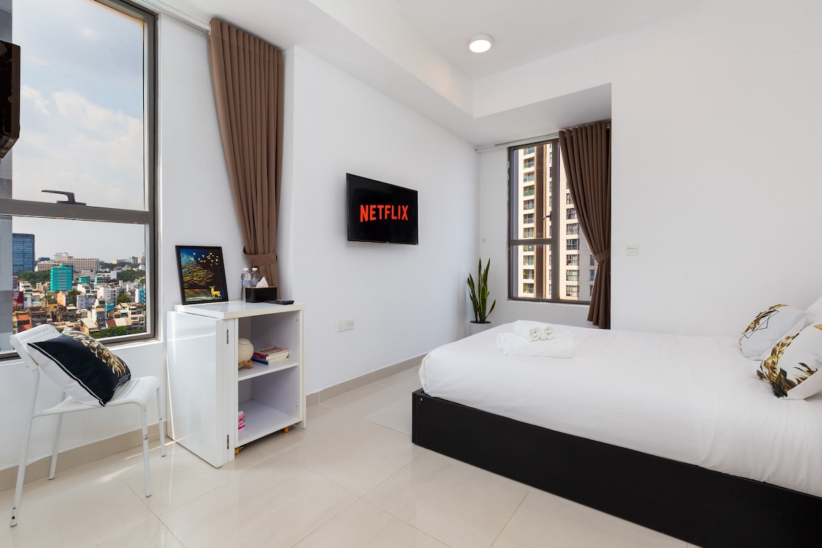 This 80m² 5🌟 luxury apartment is located in District 1, overlooking the river and the whole city, a prime location near Bui Vien, Ben Thanh Market and Nguyen Hue Walking Street within a 2km radius. The apartment has 2 bedrooms (3 beds, including 2 King beds 1m8x2m and 1 Queen bed 1m4x2m), 2 bathrooms and full facilities such as saltwater infinity pool, gym, dry and wet sauna. Enjoy the cozy feeling of being at home in this modern building.