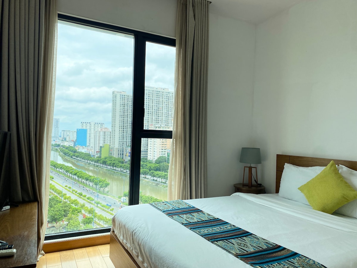 This 80m² 5🌟 luxury apartment is located in District 1, overlooking the river and the whole city, a prime location near Bui Vien, Ben Thanh Market and Nguyen Hue Walking Street within a 2km radius. The apartment has 2 bedrooms (3 beds, including 2 King beds 1m8x2m and 1 Queen bed 1m4x2m), 2 bathrooms and full facilities such as saltwater infinity pool, gym, dry and wet sauna. Enjoy the cozy feeling of being at home in this modern building.