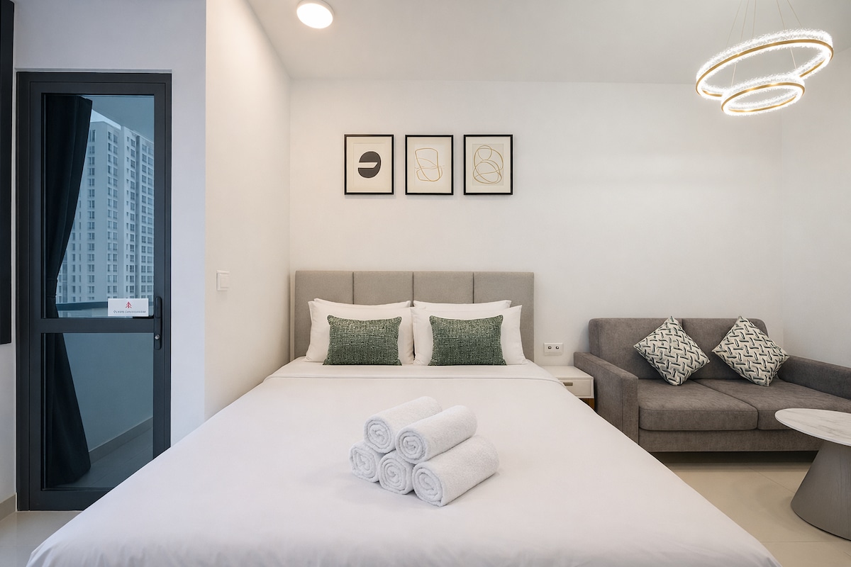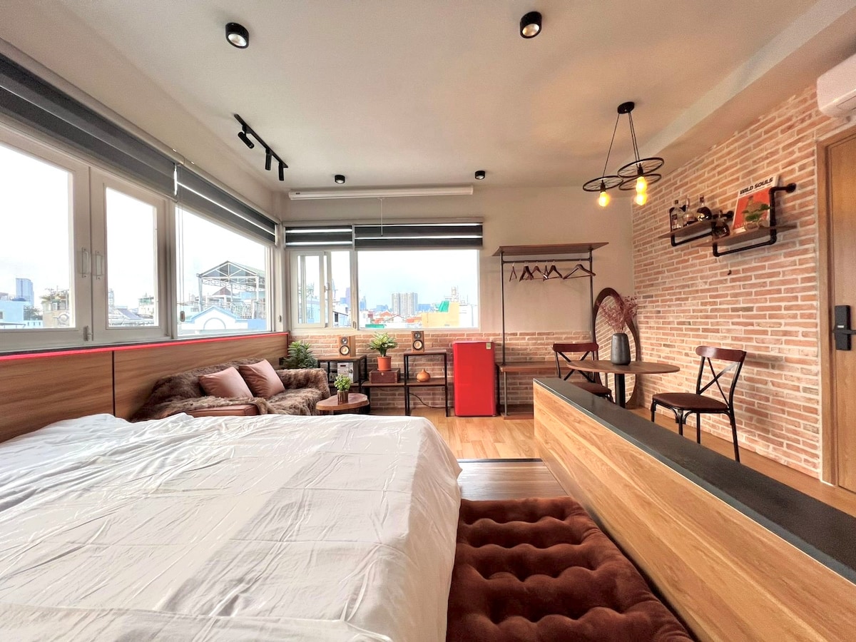 A modern duplex apartment in the heart of District 1, just 20m from Nguyen Hue Walking Street. The space includes a cozy mezzanine with a King bed, a sofa bed, and a fully equipped kitchen-ideal for couples, small groups, or business travelers seeking a private stay close to major attractions, dining spots, and city events. Enjoy coffee with a street view, take an evening walk to feel Saigon’s vibrant energy, then return to a warm, peaceful space to unwind.