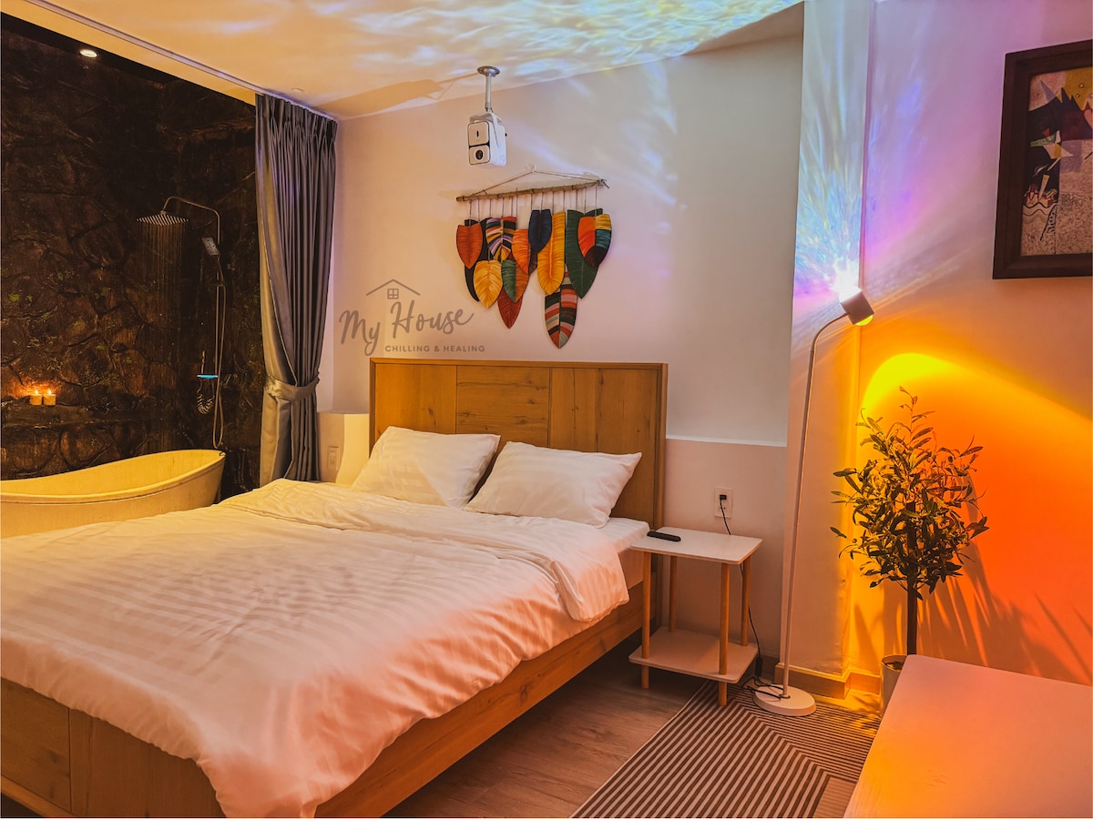 Discover a hidden gem in our oasis, nestled amidst nature's embrace. You can truly unwind, and cherish special moments as you refresh under the open sky with our outdoor shower or soak in a luxurious bathtub. Every corner is designed with love, making it an ideal retreat for couples seeking an unforgettable and intimate experience. 15 minutes from Ben Thanh, Plenty of street food stalls scattered nearby, while having a projector with Premium Netflix, Youtube. Hideaway from the world with us ♥