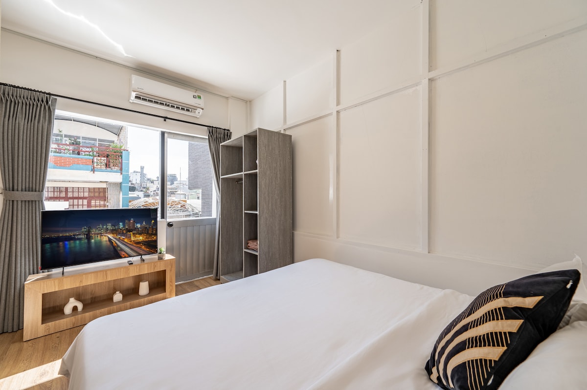 It's a cozy room right at the city center. Location is very convenient with many coffee shop, restaurant, street food, gym, etc. nearby. - Add: Nguyen Dinh Chieu st, District 3 - 5 mins to District 1 - 1 double bed, soft mattress & pillow to sleep - Elevator, air conditioner, TV & cable, wifi, wardrobe, desk, chair, sofa, safe box... - Kitchen: fridge, kettle, induction cooker, pot, bowl, cup, dish - Private bathroom: hot shower & a bathtub - FREE cleaning & motorbike parking - Friendly staffs