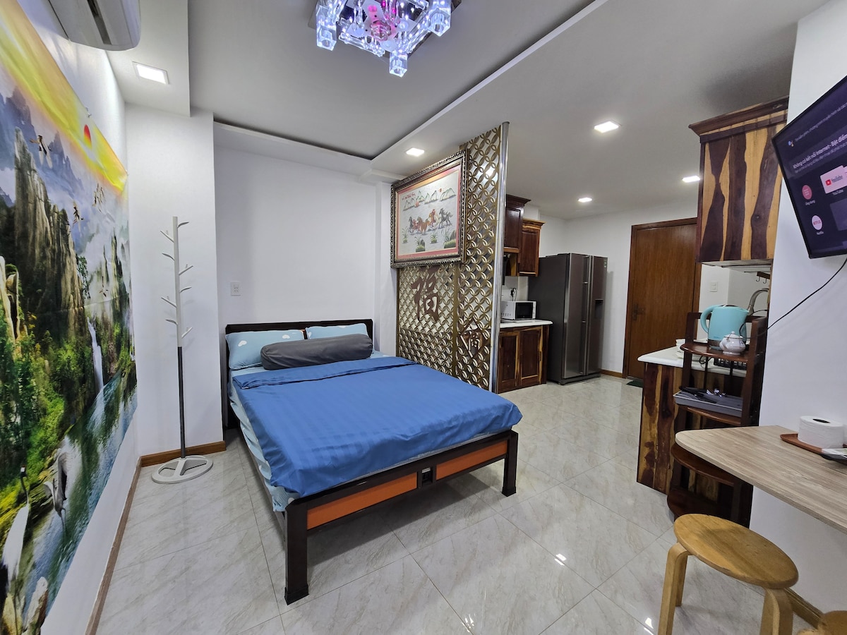 Welcome to our cozy, clean studio in the heart of the city. It features a double bed, large fridge, electric stove, microwave, range hood, kettle, dining table, and wall-mounted TV. The wooden kitchen includes full cooking utensils. Private bathroom with walk-in shower and stylish sink. Equipped with A/C, strong Wi-Fi, and a decorative room divider. Ideal for short or long stays.