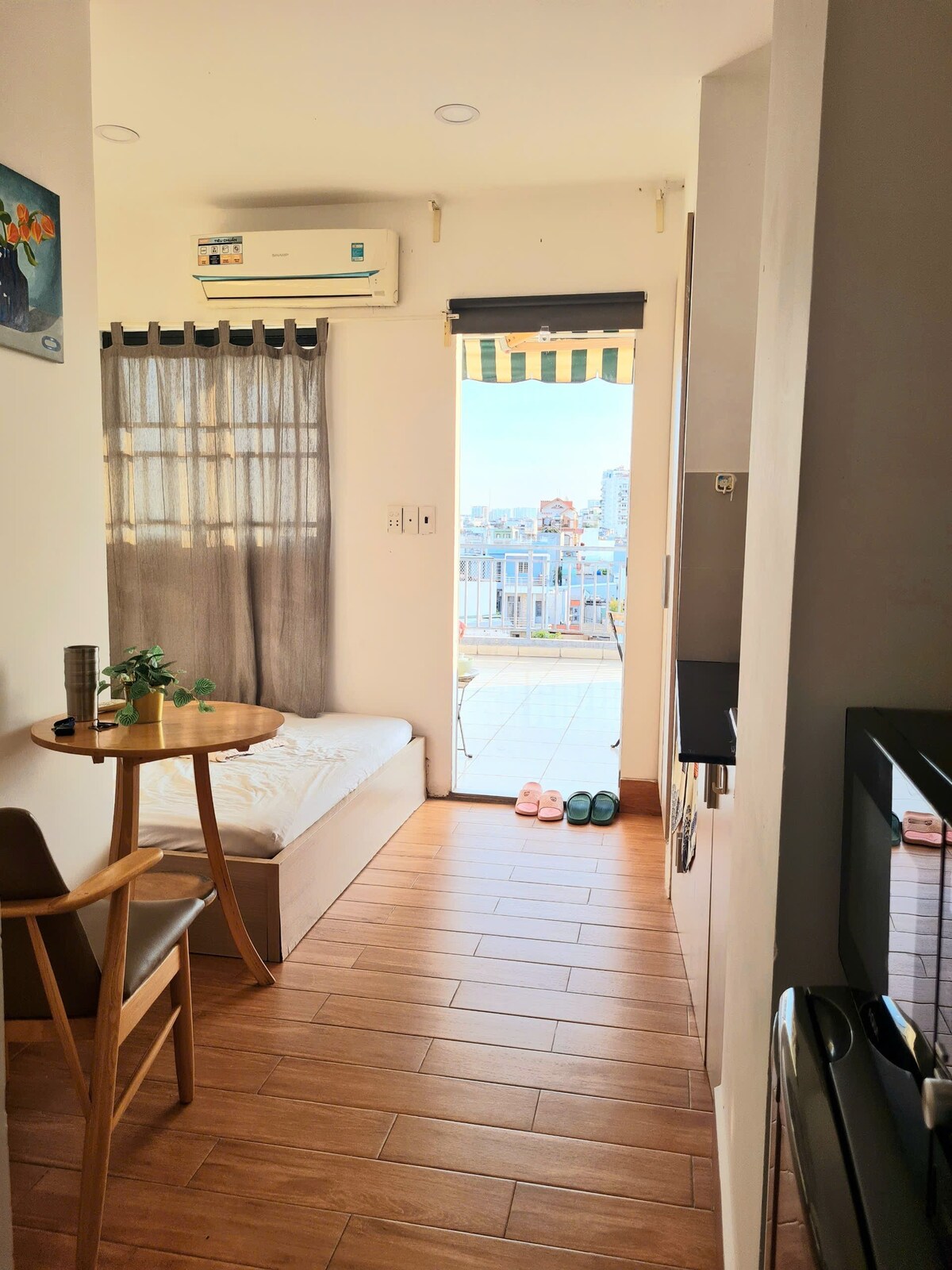 căn studio có ban công lớn, được trang bị đầy đủ tiện nghi sinh hoạt, tòa nhà nép mình trên 1 con đường yên tĩnh, chỉ mất 5 phút đi bộ đến khu phố ẩm thực và có thể di đến các quạn trung tâm chỉ từ 10 phút đi xe