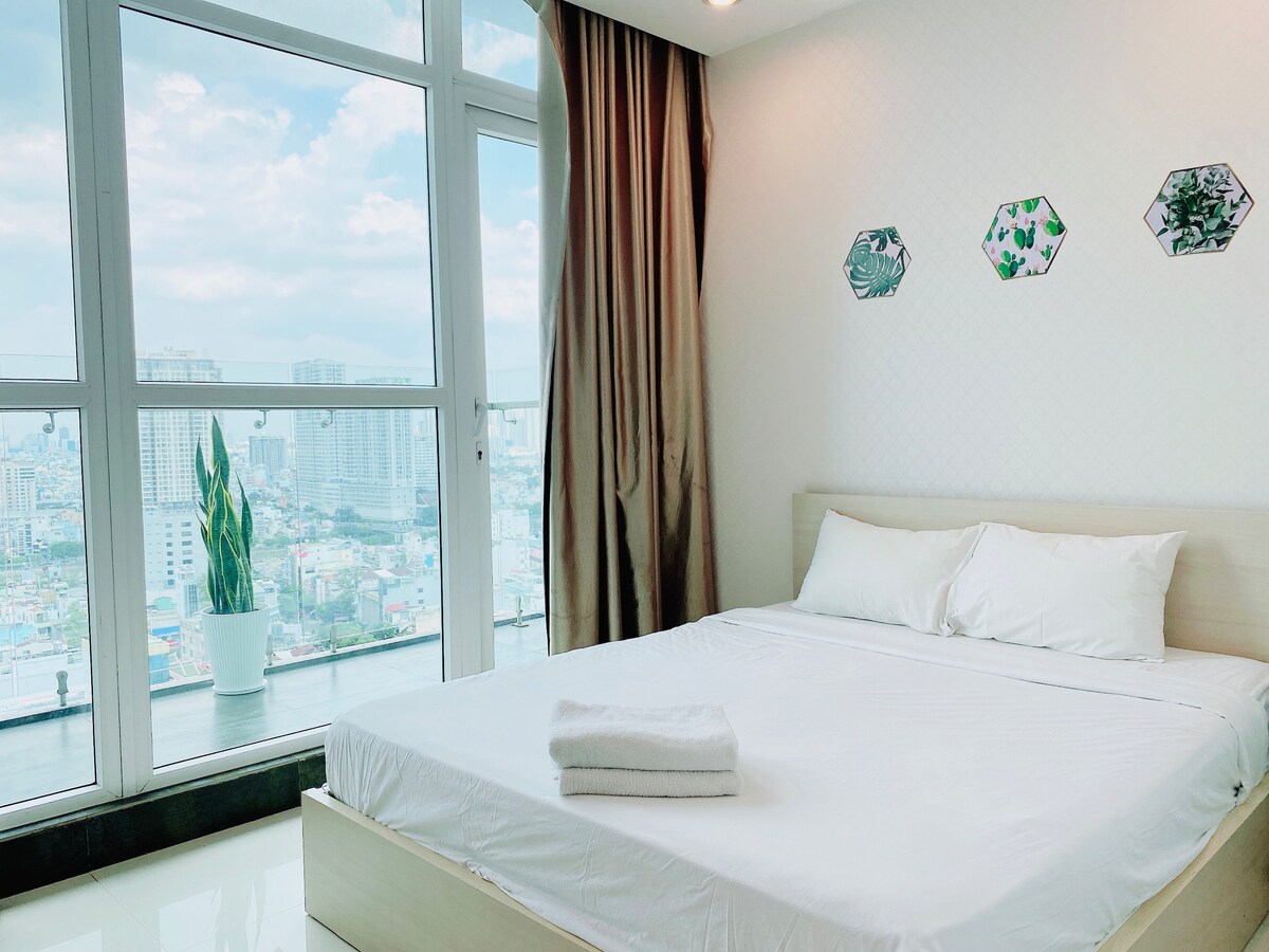 Our apartment is not only located in the heart of Ho Chi Minh City, but also hosted by a warm and hospitable owner who is always ready to help. Bedroom: Cozy queen-size bed with premium comfort. Living space: Spacious 80m², ideal for 2 adults and 1 child under 5. Bathroom: Fully equipped with shower, shampoo, shower gel, toothpaste, hair dryer, and hot & cold water. Windows: Large windows inviting plenty of natural sunlight.