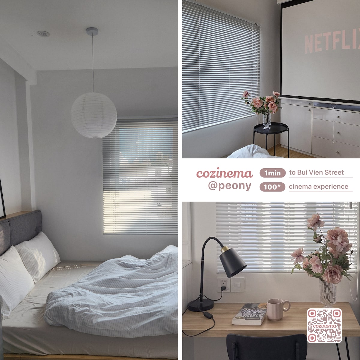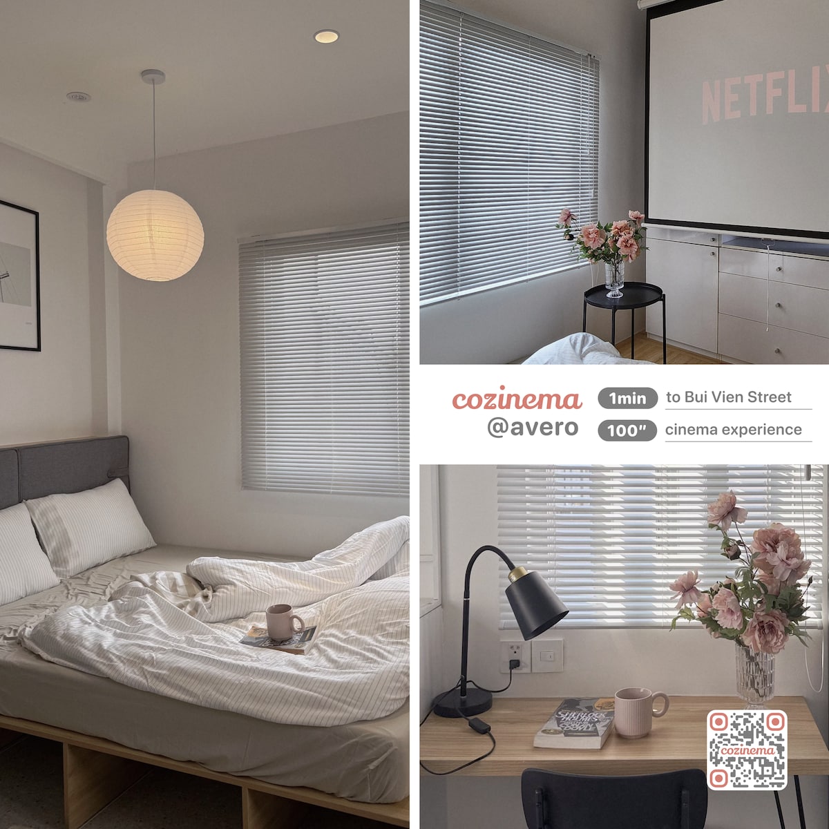 Kanso @ Cozinema offers three unbeatable features: 1. Prime Location: Heart of HCMC, 1 min to Bui Vien Street and 5 mins to Ben Thanh Market. Surrounded by cafés, local eats, and public transports right at your doorstep. 2. Skyline & Parkfront Views: Enjoy a breezy balcony overlooking 23/9 Park, blending lush greenery with stunning city skyline lights at night - the perfect balance of calm and vibrant. 3. Cinematic Retreat: 100" 4K projector & Dolby 5.1 audio for ultimate relaxation.