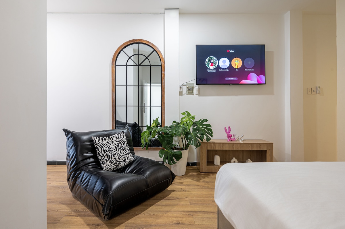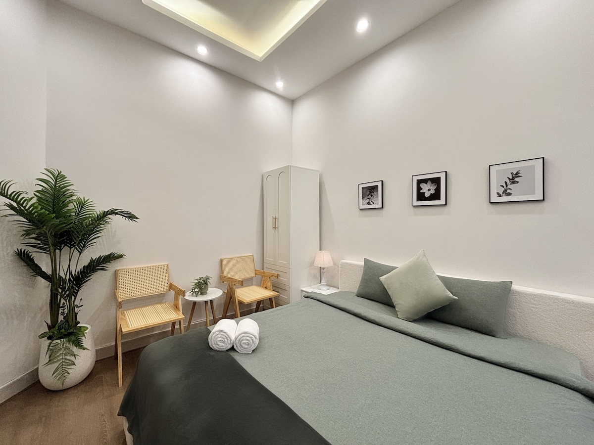 Deluxe Room with Mini Garden mang hơi thở thiên nhiên gam xanh mát mắt, thiết kế hiện đại kết hợp tinh tế với chất liệu tự nhiên như mây tre và gỗ, tạo nên không gian thư giãn hoàn hảo. - Giường lớn êm ái - Khu ngồi đọc sách hoặc làm việc riêng trong phòng - Trang bị máy lạnh, Wi-Fi tốc độ cao, Smart TV có Netflix - Khu café sân vườn riêng biệt - Trong phòng có sẵn cà phê/trà miễn phí - Hỗ trợ thuê dài hạn theo tháng - Vị trí trung tâm dễ dàng di chuyển các điểm tham quan