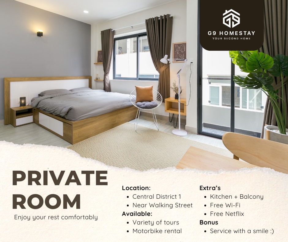 Welcome to our brand-new studio combining cozy and boho style. Your family will be close to everything when you stay at this centrally-located place - Located in the heart of HoChiMinh, it's quiet both day and night because of being at 4th floor - Owning an awesome view from the large street-side window. Looked like the photos, full of necessary amenities, outstanding by full HD projector - No curfew - 24/7 accessibility with clear instruction - High-speed and private WiFi, fully air-conditioned
