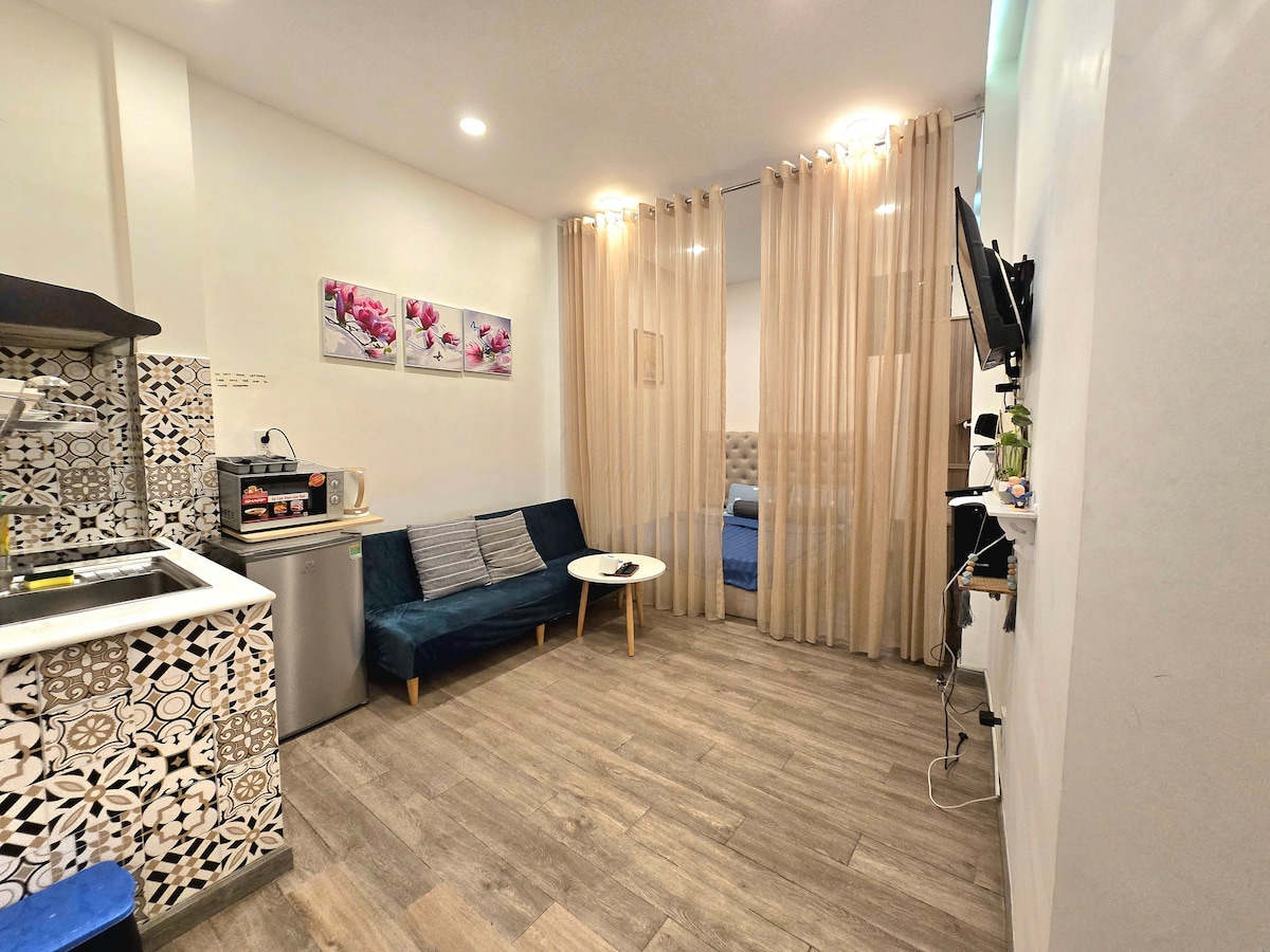 Cozy, very clean studio on 5th floor (no elevator). Private wooden stairs access. Fully equipped: kitchen, microwave, fridge, office chair. Not suitable for guests with heavy luggage or leg/mobility issues. Spacious balcony. Toothpaste, toothbrush & laundry detergent not provided. Nearby: supermarket, coffee shops, restaurants, Nhieu Loc Canal. Only 1 motorbike parking spot available. Room cleaned weekly.