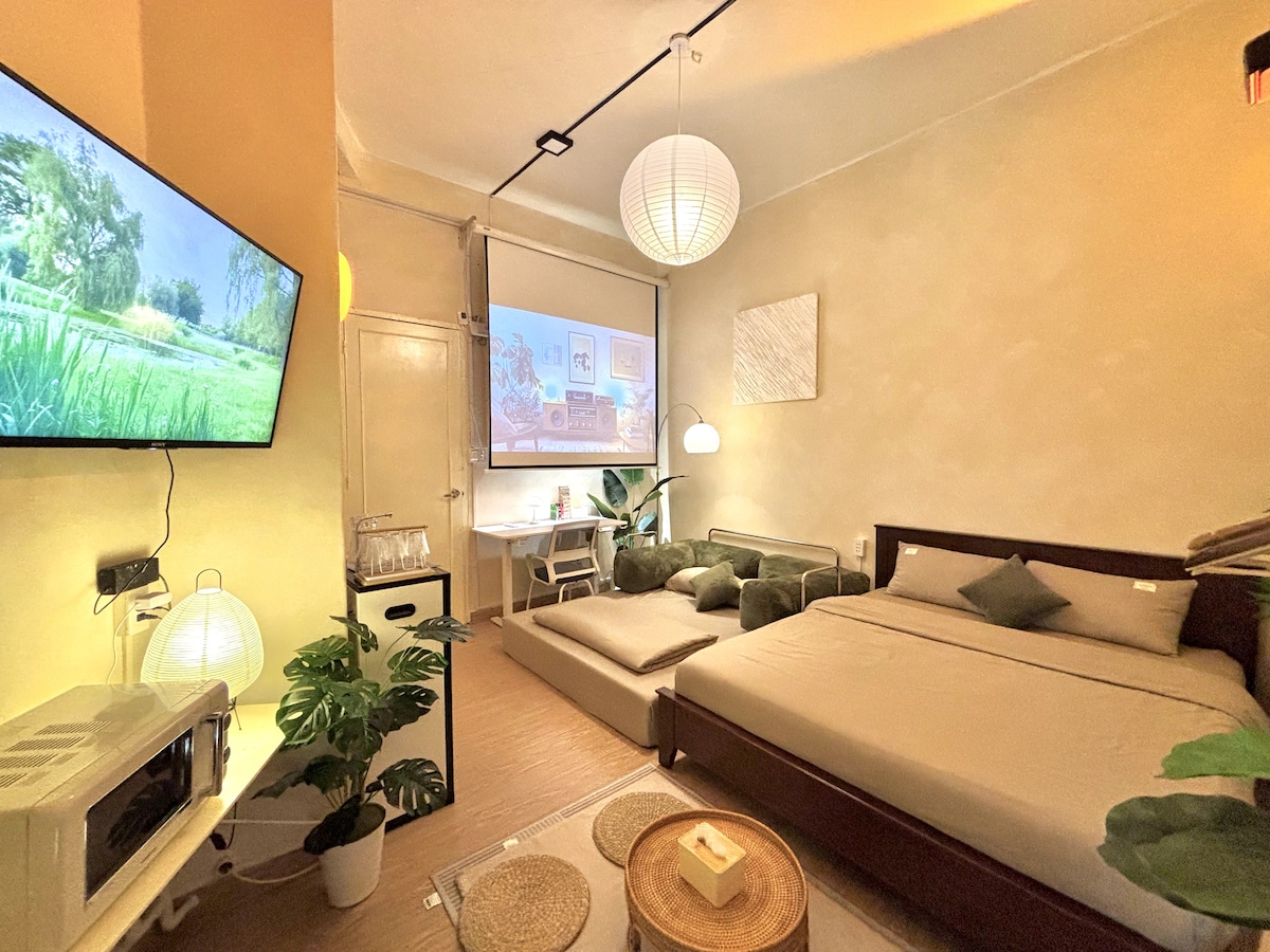 Kanso @ Cozinema offers three unbeatable features: 1. Prime Location: Heart of HCMC, 1 min to Bui Vien Street and 5 mins to Ben Thanh Market. Surrounded by cafés, local eats, and public transports right at your doorstep. 2. Skyline & Parkfront Views: Enjoy a breezy balcony overlooking 23/9 Park, blending lush greenery with stunning city skyline lights at night - the perfect balance of calm and vibrant. 3. Cinematic Retreat: 100" 4K projector & Dolby 5.1 audio for ultimate relaxation.