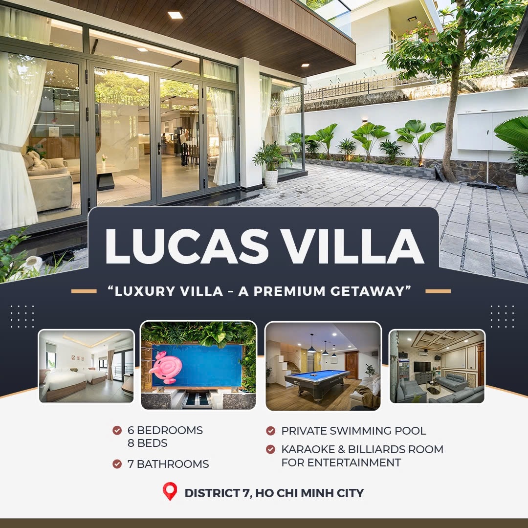 🌴 Villa Sang Trọng 6 Phòng Ngủ Tại Quận 7 – Kỳ Nghỉ Đẳng Cấp 🌴 ✅ Hồ bơi riêng ✅ Sân vườn rộng rãi, BBQ ngoài trời ✅ Phòng karaoke, bàn bi-a giải trí ✅ 6 Toilet trong phòng ngủ và 1 Toilet phòng Karaoke ✅ Nội thất sang trọng, đầy đủ tiện nghi